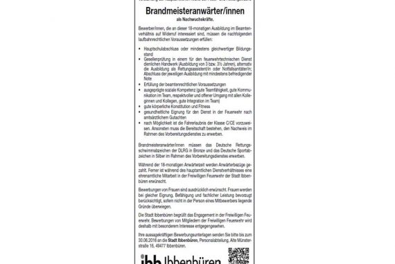 6. Juni 2016, 17:31 Uhr•Schlagwörter: Brandmeisteranwärter/innen, Stellenausschreibung
