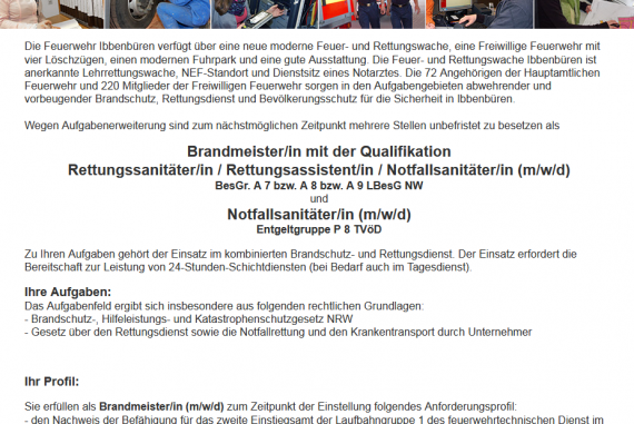 Bei der Stadt Ibbenbüren sind im Fachdienst Feuerwehr und Rettungsdienst aktuell mehrere Stellen zu besetzen. » weiterlesen