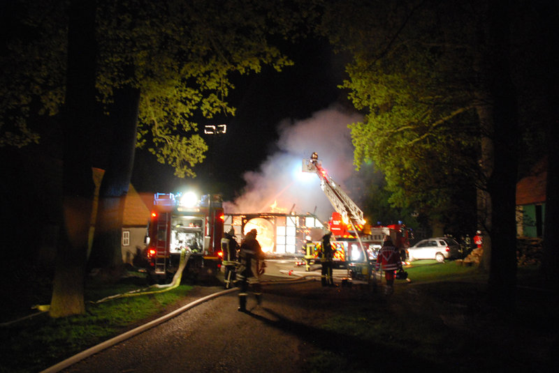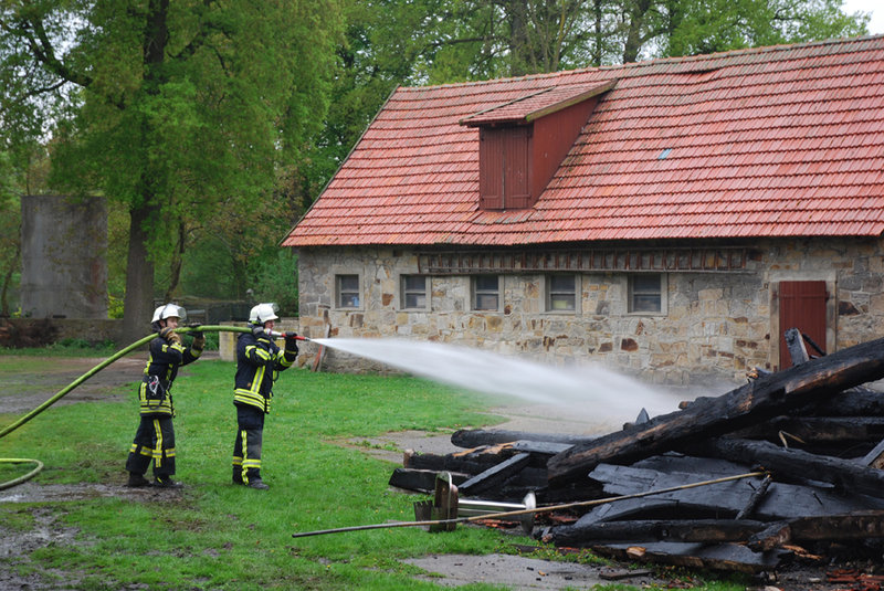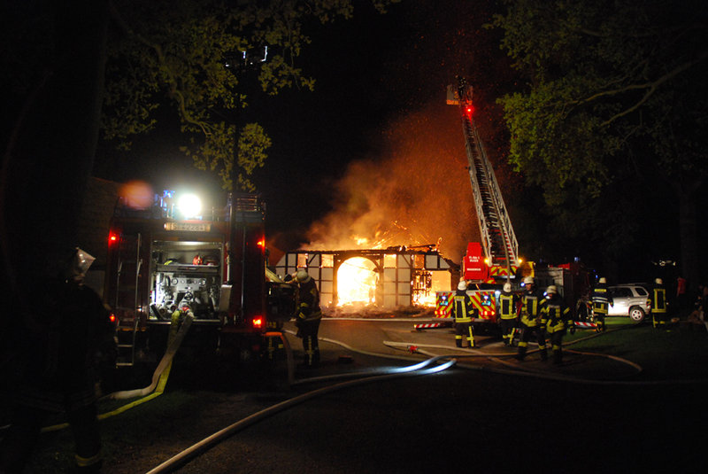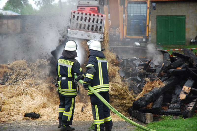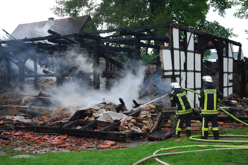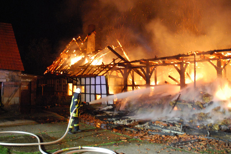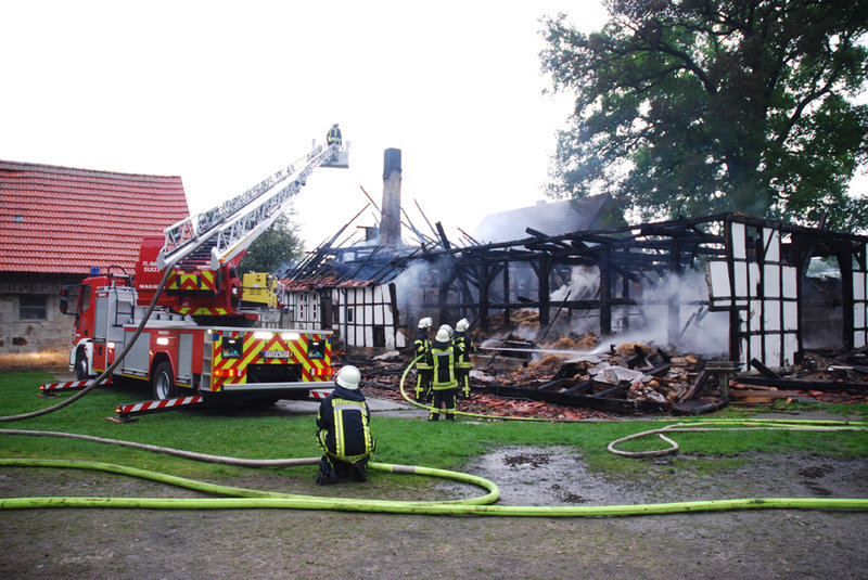 Als Löschmaßnahmen wurde zunächst das angrenzende Wohnhaus durch eine Riegelstellung geschützt, so dass das Feuer auf die in Fachwerkbauweise errichtete, über 200 Jahre alte Scheune begrenzt blieb. Diese brannte allerdings sehr rasch, trotz des Einsatzes von vier C-, einem B-Rohr und dem Werfer der Drehleiter vollkommen aus.
