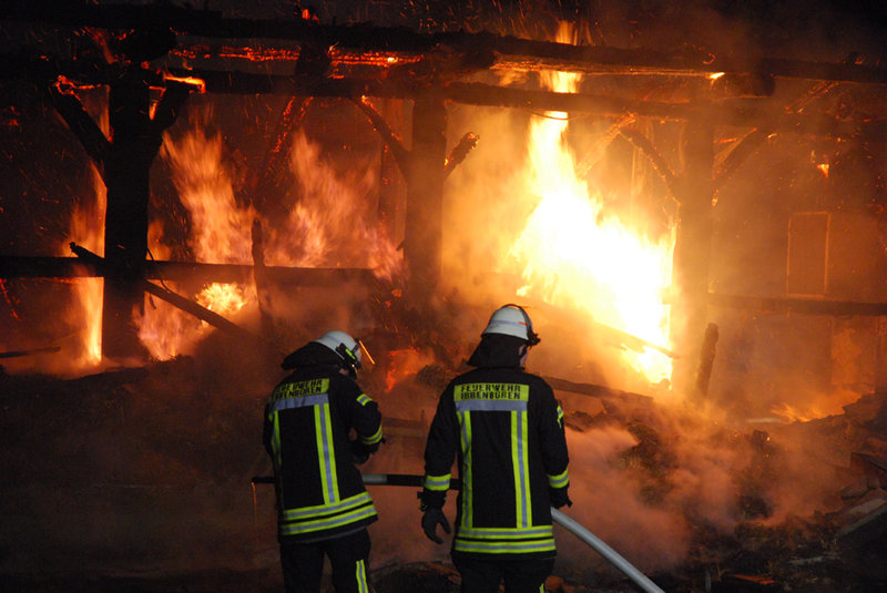Einsatzbericht: Die Feuerwehr Ibbenbüren wurde in der Nacht von Freitag auf Samstag, um 03.05 Uhr, zu einem Dachstuhlbrand an der Maybachstraße alarmiert. Bei Eintreffen der erstalarmierten Kräfte vom Dienstbetrieb und dem Löschzug Stadtmitte 1 stand die ca. 10 x 30 Meter große Scheune bereits in