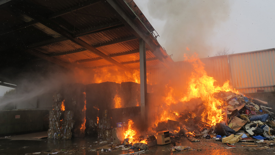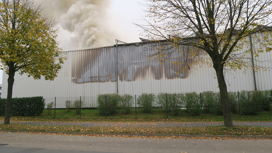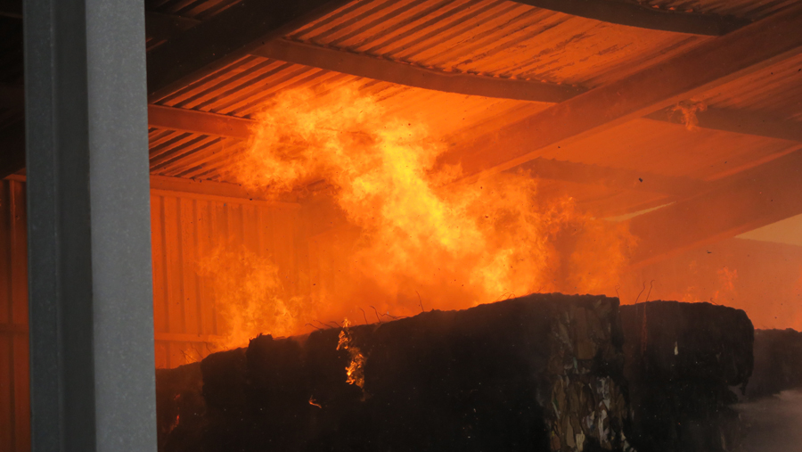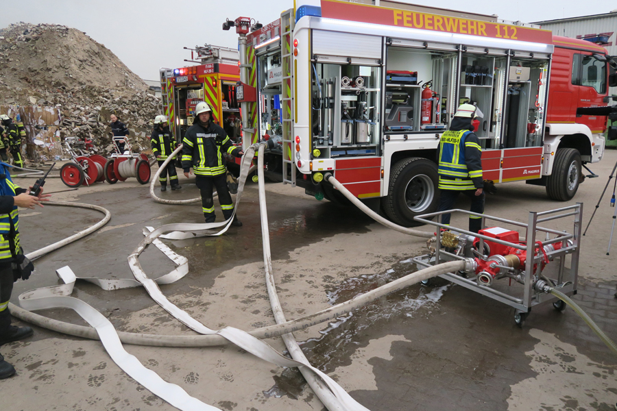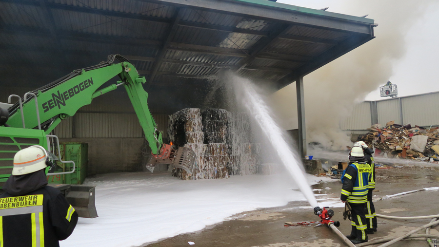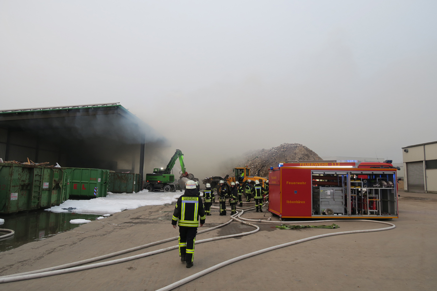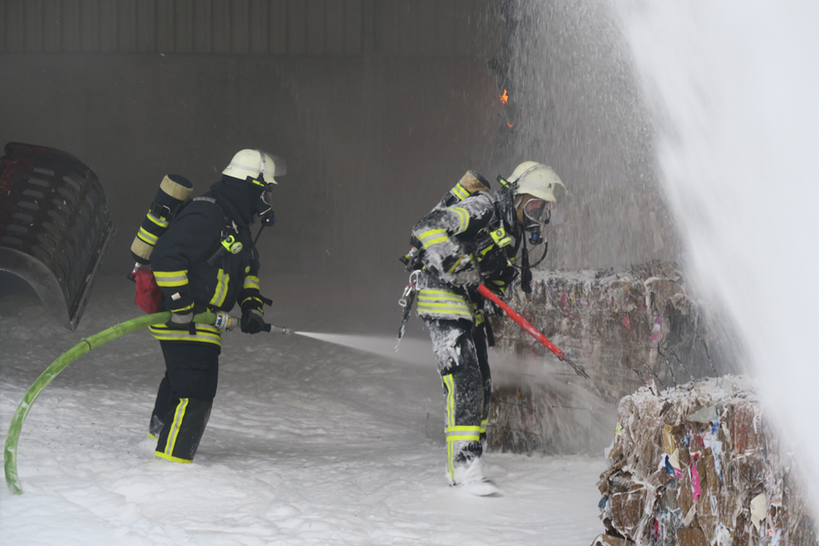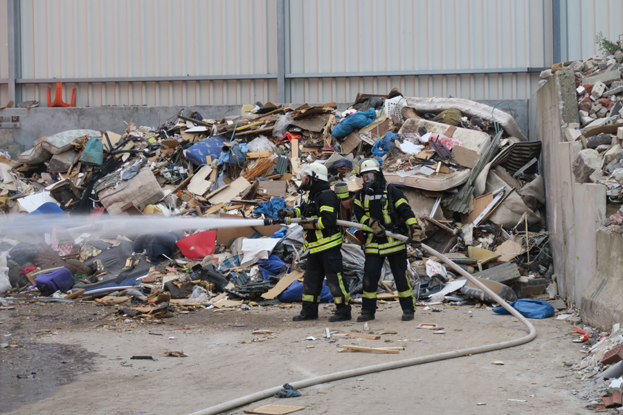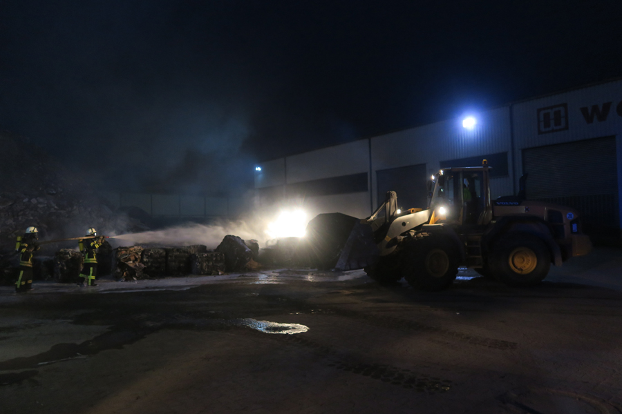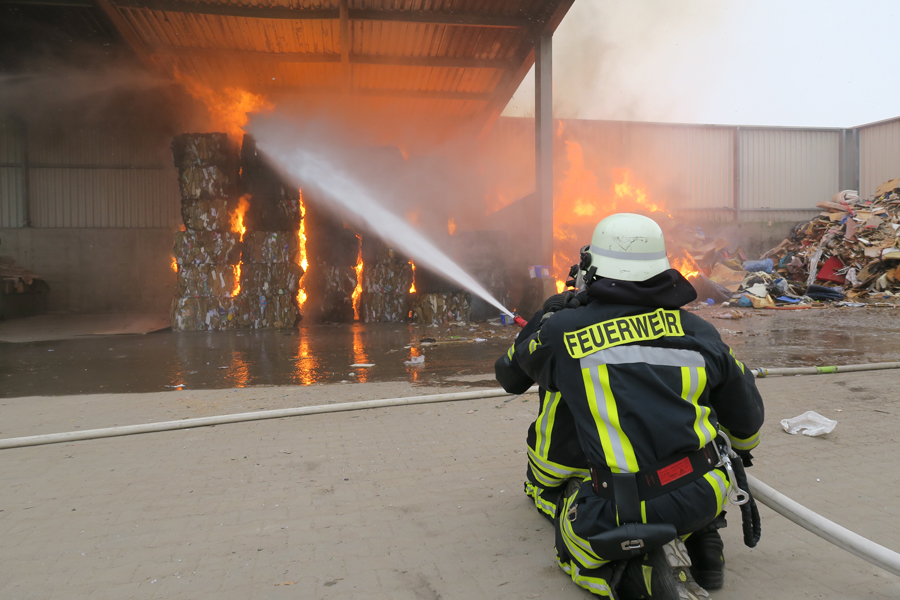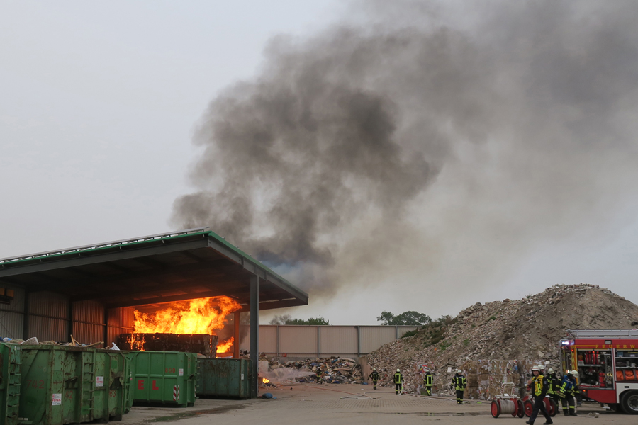 Vor Ort stellten die Einsatzkräfte im Außengelände einen Brand in einem Mülllager fest, welcher sich sehr schnell auf ein angrenzendes Altpapierlager, unter einer Überdachung, ausgebreitet hatte.