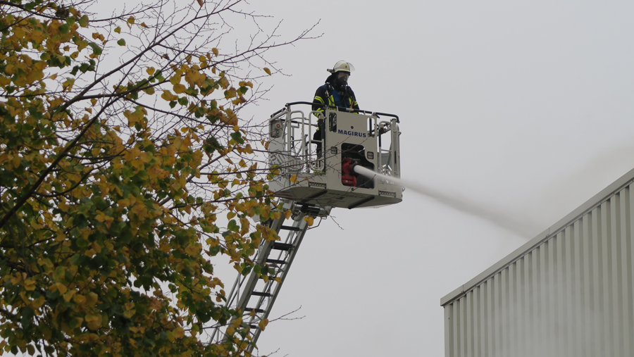 Es wurde ein massiver Löschangriff mit Wasser und Schaum  durch mehrere Trupps unter umluftunabhängigem Atemschutz vorgetragen und eine leistungsfähige Wasserversorgung mittels SW 2000 vom angrenzenden Kanal aufgebaut. Aus dem Korb der Drehleiter wurde mit Hilfe des Werfers die Ausbreitung des Brandes auf eine auf dem Dach befindliche Photovoltaikanlage eingedämmt.