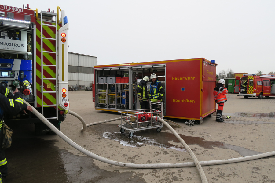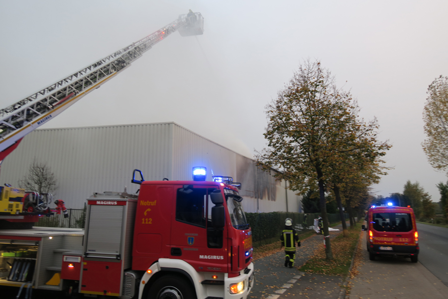 Einsatzbericht: Am Dienstagnachmittag wurden der Dienstbetrieb und die Löschzüge Stadtmitte 1 und 2 unter dem Stichwort „Brand groß“ zu einem Entsorgungsunternehmen an der Zeppelinstraße in Ibbenbüren-Uffeln gerufen.