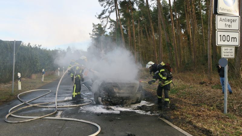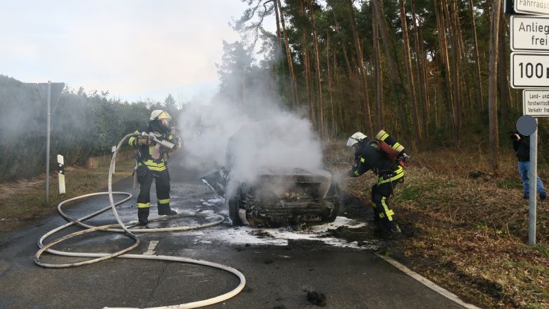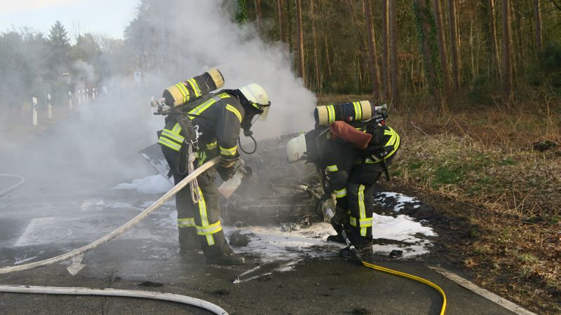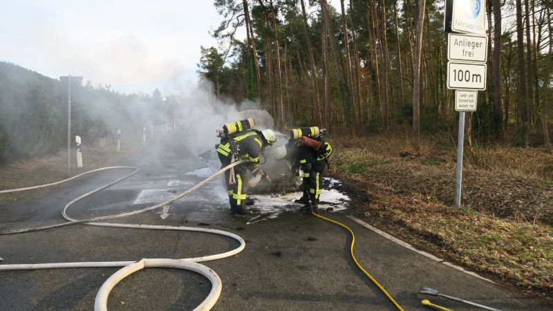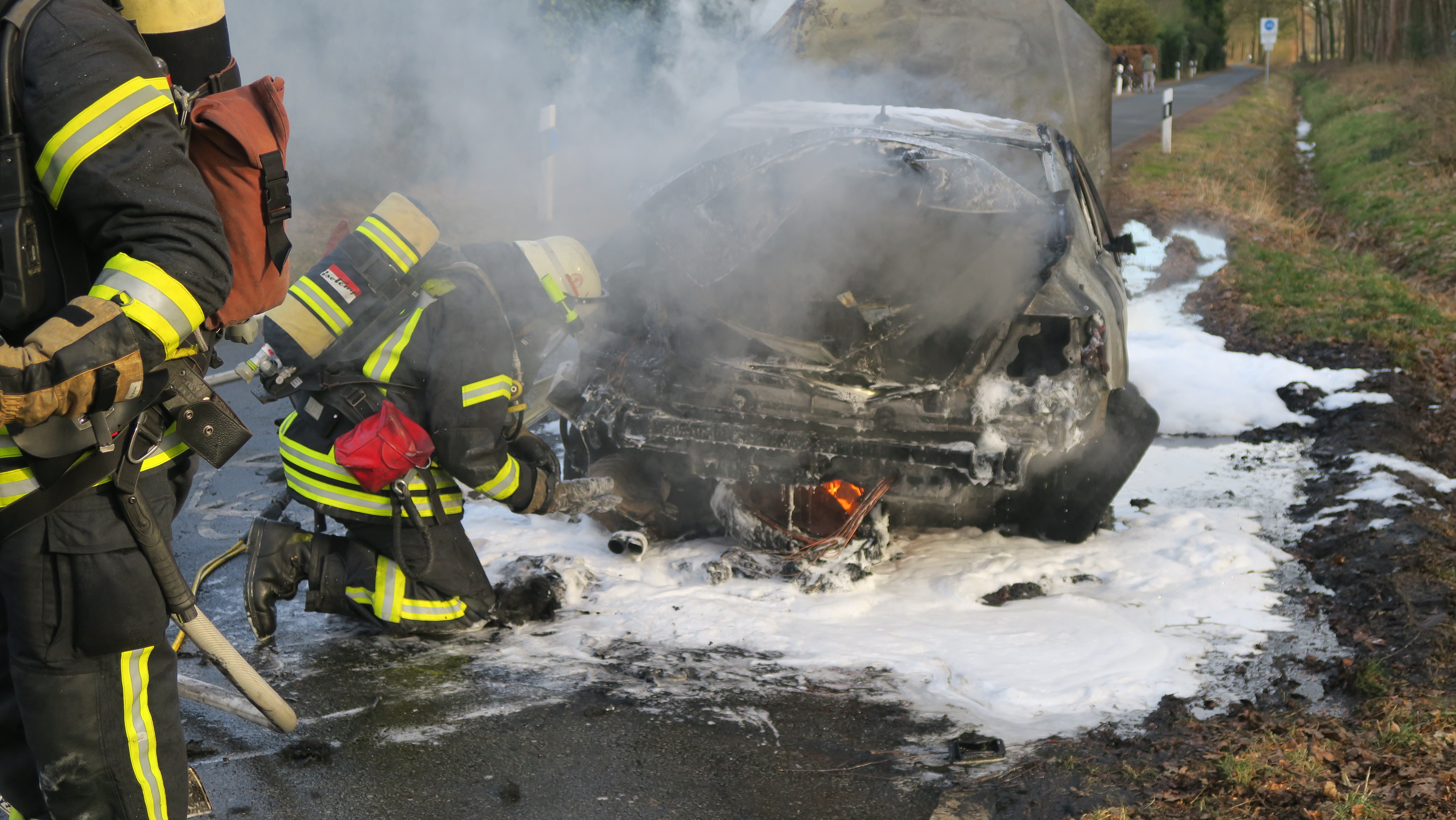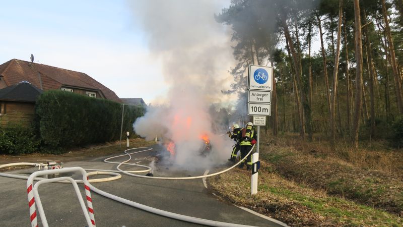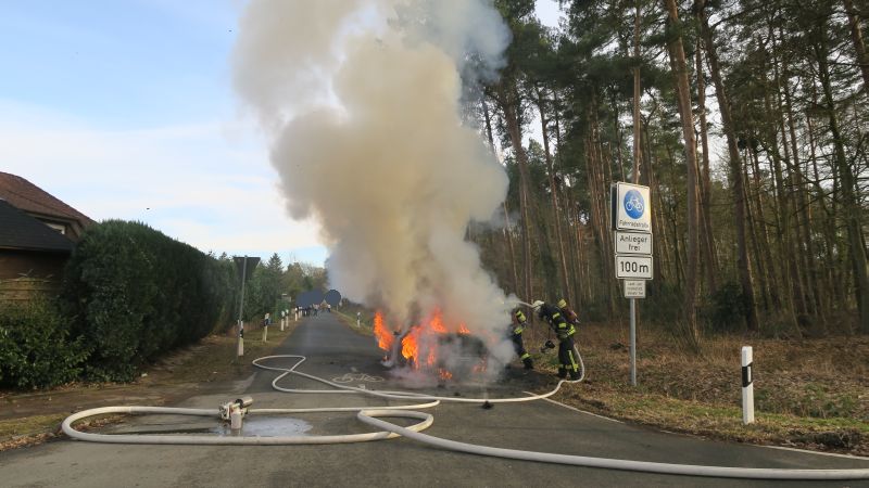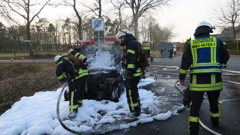 Im Bereich des „Schierloher Mühlenweg“ stand, beim Eintreffen der Feuerwehr, ein Fahrzeug in Vollbrand. Ein Trupp unter schweren Atemschutz löschte das Feuer erst mit einem C-Rohr und im weiteren Verlauf mit einer Schaumpistole.