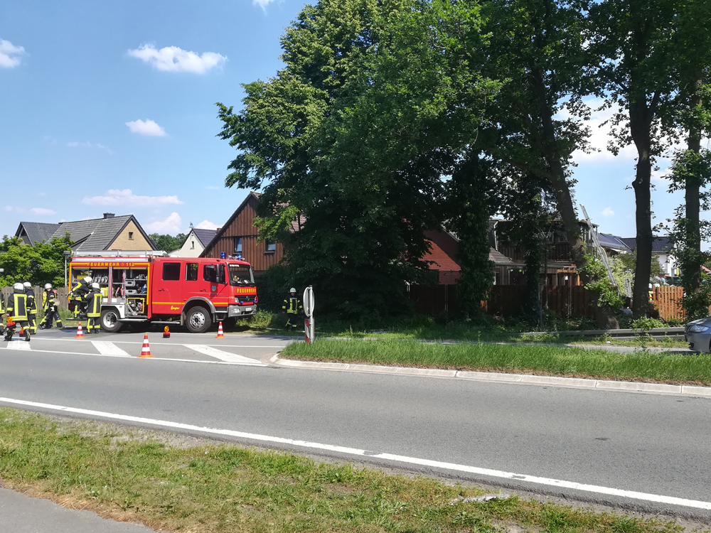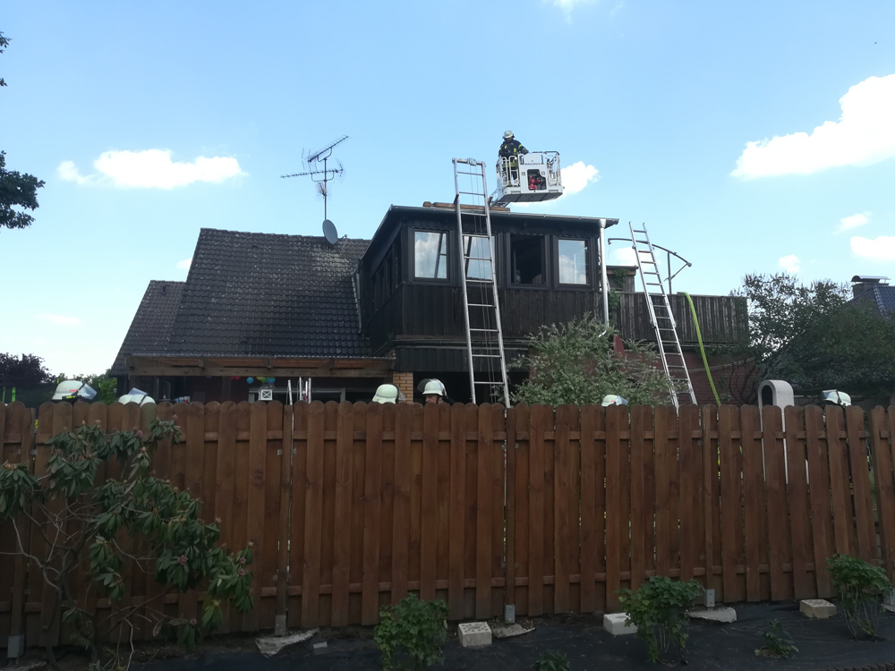 An der Einsatzstelle war es bei einem Mehrfamilienhaus im Bereich einer hölzernen Dachkonstruktion, möglicherweise nach Abdichtungsarbeiten, zu einem Brand gekommen. Es befanden sich keine Personen mehr im Gebäude. Das Feuer konnte durch einen Trupp unter PA schnell unter Kontrolle gebracht und die offenen Flammen gelöscht werden.