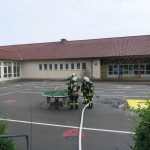 An der Schule brannte es im Lichtschacht eines Kellerfensters. Das Fensterglas war bereits gesprungen und das Feuer drohte auf den Kellerraum und die Traufenverschalung überzugreifen.