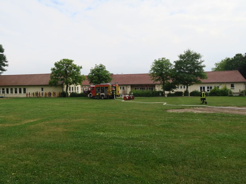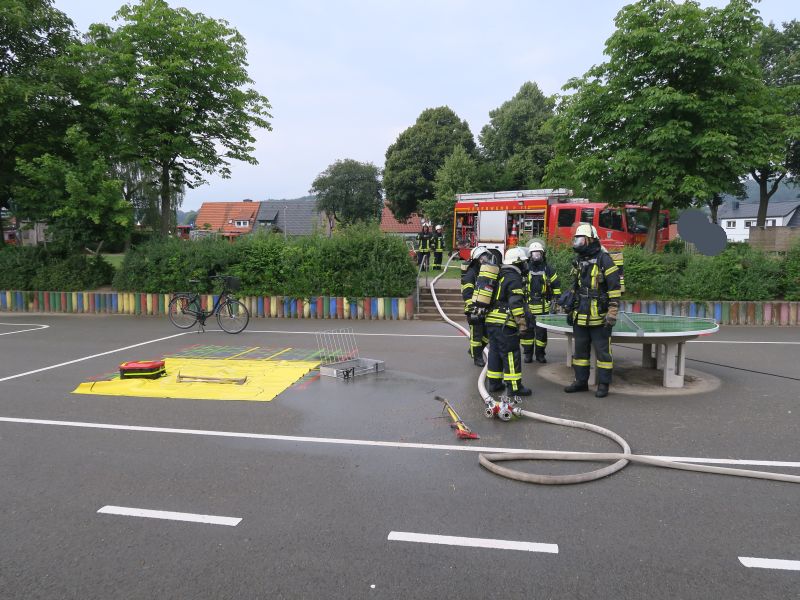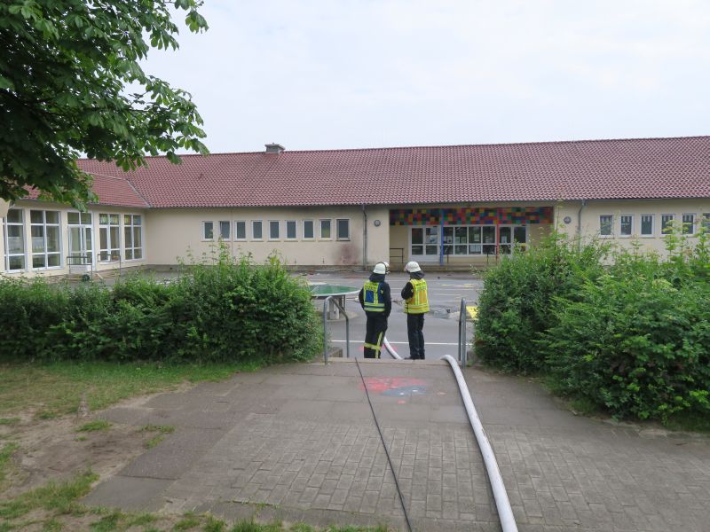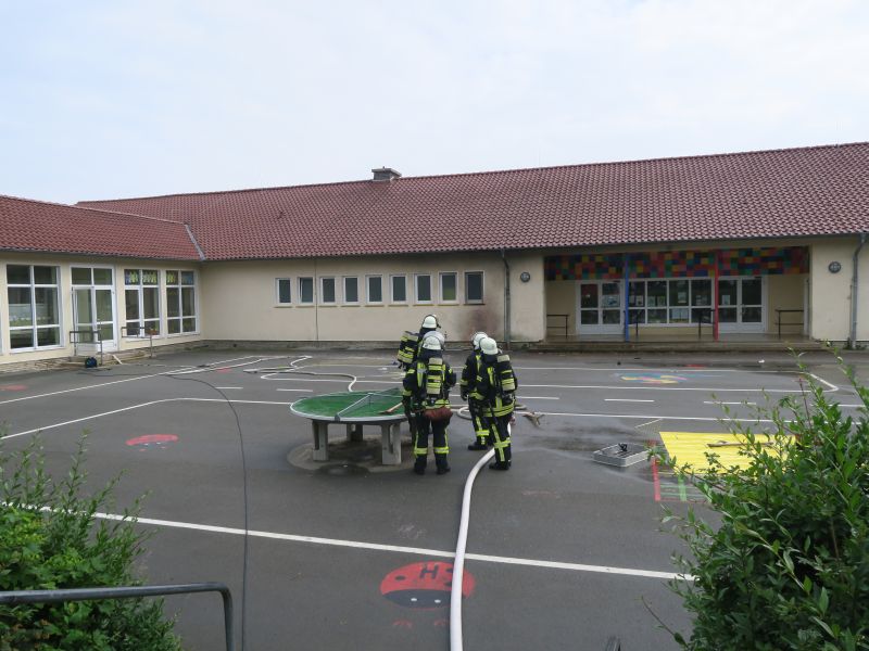 An der Schule brannte es im Lichtschacht eines Kellerfensters. Das Fensterglas war bereits gesprungen und das Feuer drohte auf den Kellerraum und die Traufenverschalung überzugreifen.