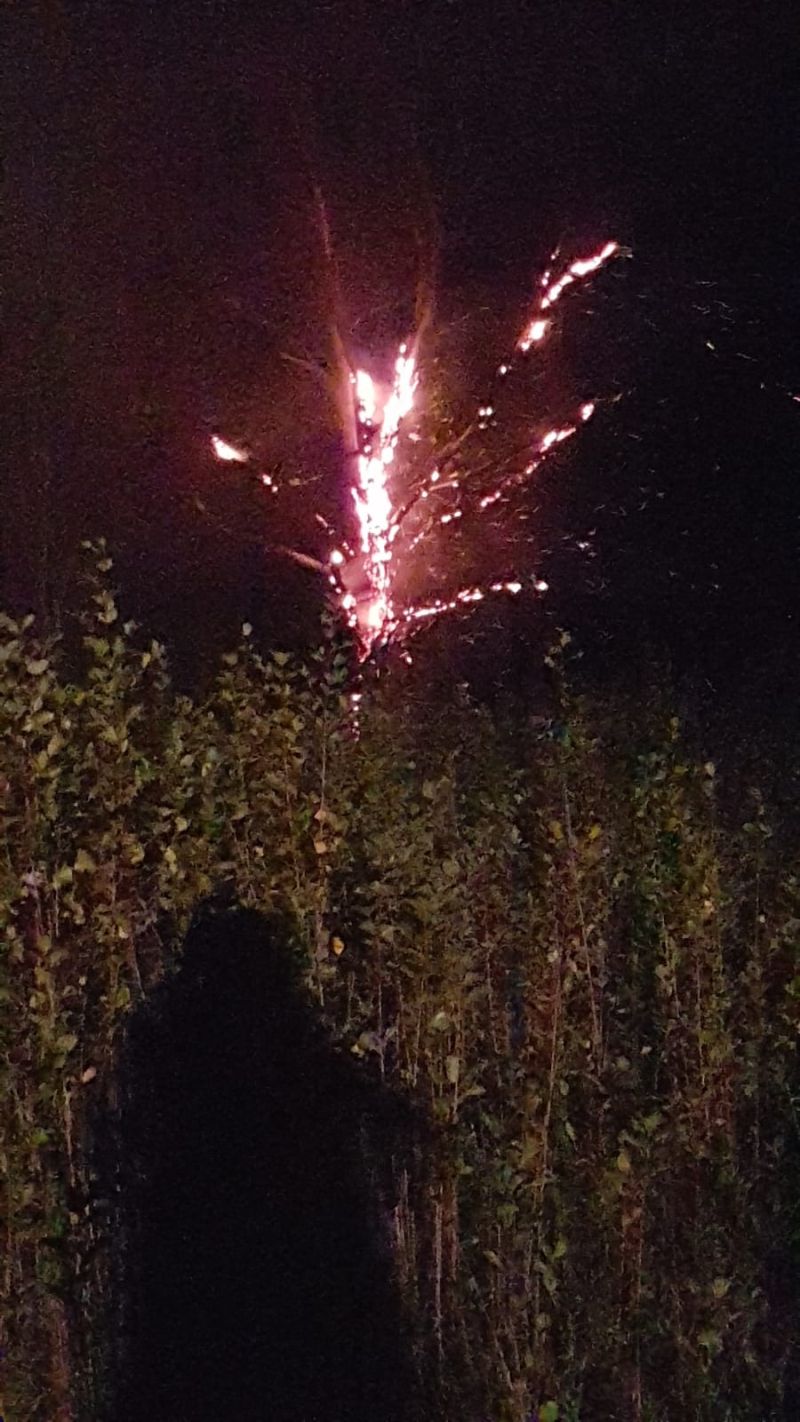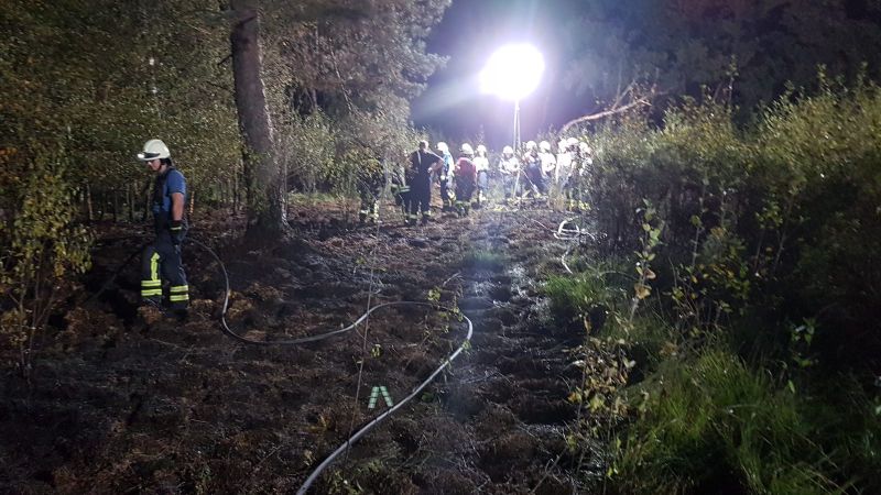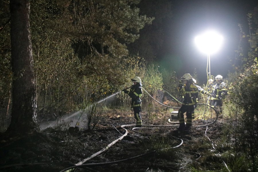 Mehrere Trupps unter umluftunabhängigem Atemschutz drangen in den Wald vor und löschten die brennende Waldfläche mit mehreren C-Rohren ab. Der brennende Baum wurde gefällt.