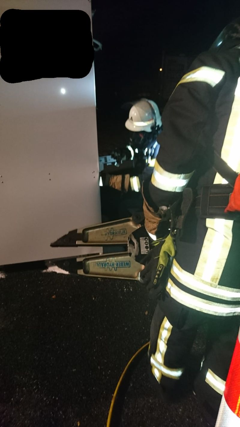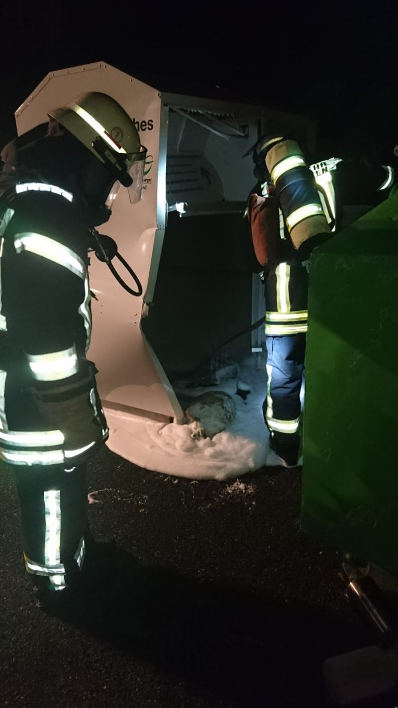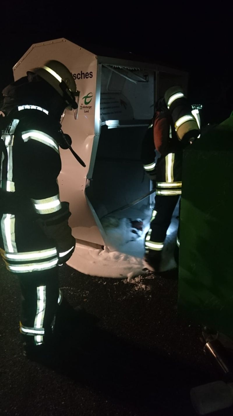 Ein in Brand stehender Altkleidercontaier wurde von einem Trupp unter PA mit hydraulischen Rettungsgerät geöffnet. Danach wurde das Feuer mit einem C-Rohr und einer Schaumpistole gelöscht.