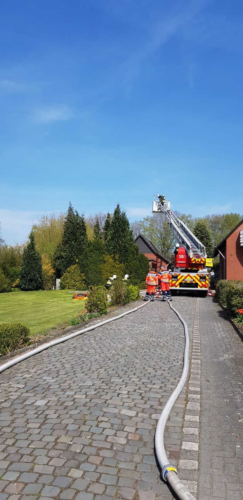Durch einen zweiten Trupp unter PA und über die Drehleiter wurde der Dachbereich des Gebäudes kontrolliert.