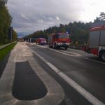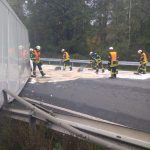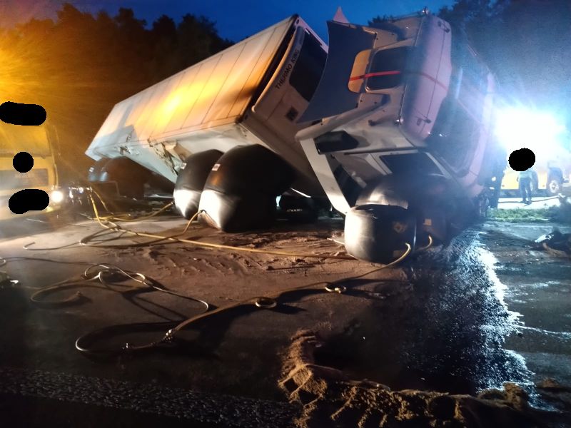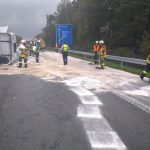 Durch die Einsatzkräfte wurde der Brandschutz sichergestellt und die großflächig ausgelaufenen Betriebsstoffe mit Ölbindemittel abgestreut.