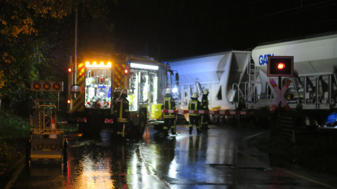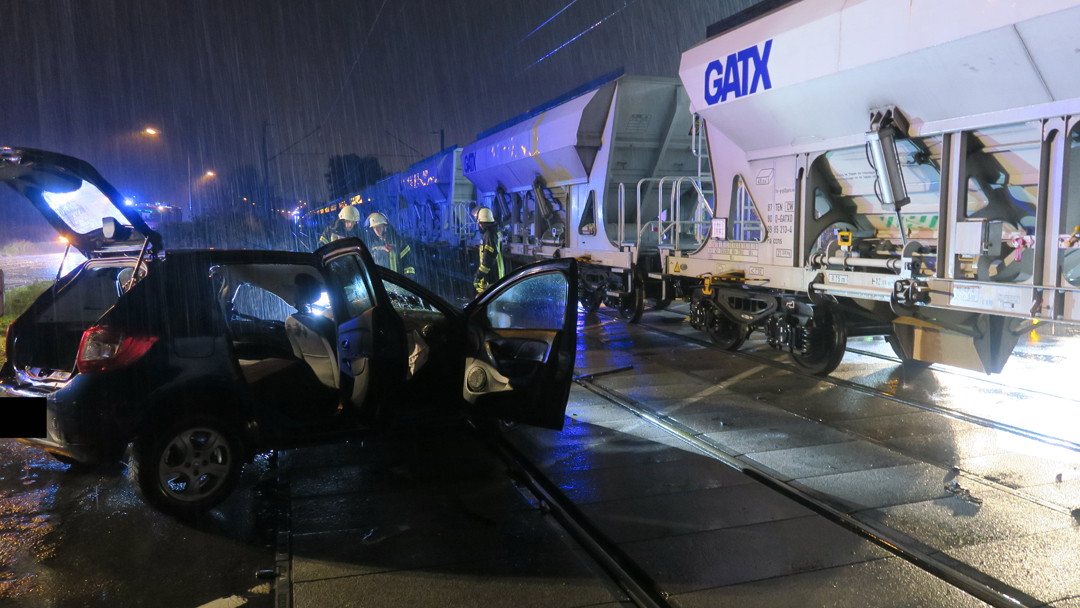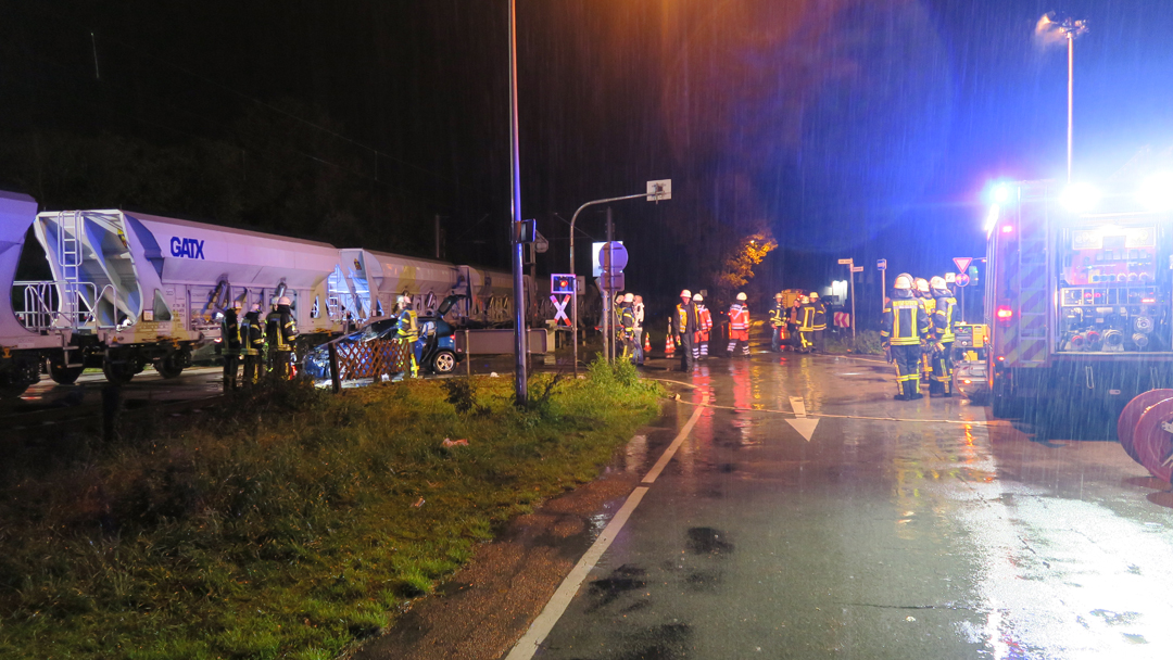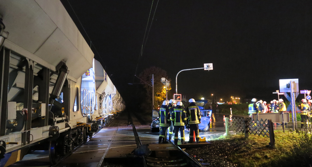 An der Einsatzstelle war ein PKW aus ungeklärter Ursache mit einem Güterzug zusammengestoßen. Eine Person war in dem PKW eingeklemmt.