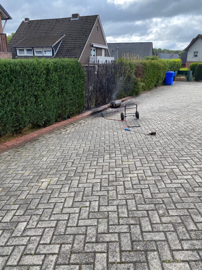 Bei Arbeiten mit einem Gasbrenner, hat sich eine Propangasflasche aus ungeklärter Ursache entzündet. Eine angrenzende Hecke entzündete sich dadurch ebenfalls.