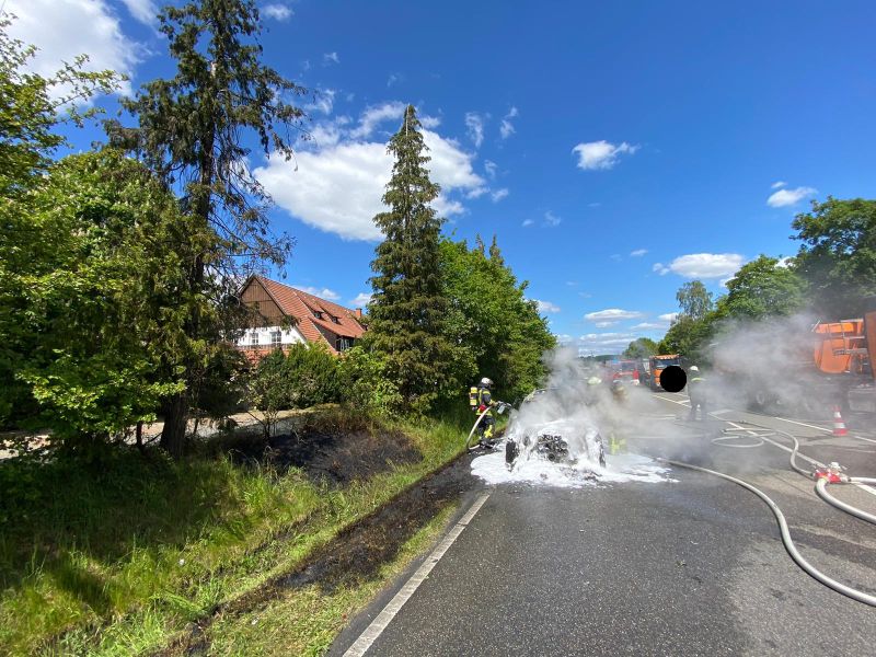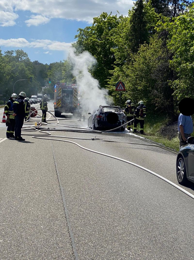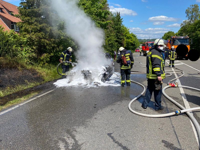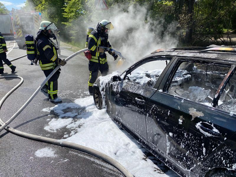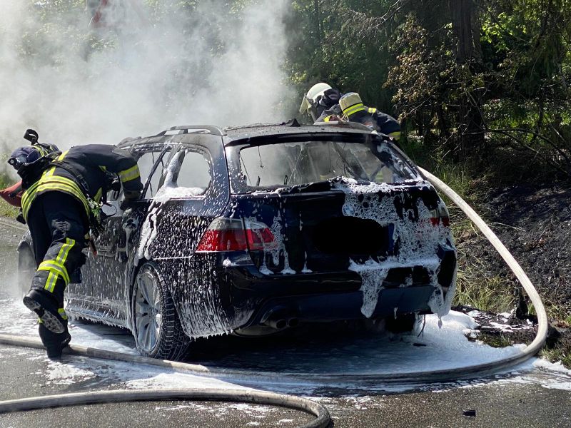 Beim Eintreffen der Einsatzkräfte brannte ein PKW in voller Ausdehnung. Auch der angrenzende Böschungsbereich hatte Feuer gefangen. Der Brand wurde von einem Trupp unter PA mit einem C-Rohr und einer Schaumpistole gelöscht.