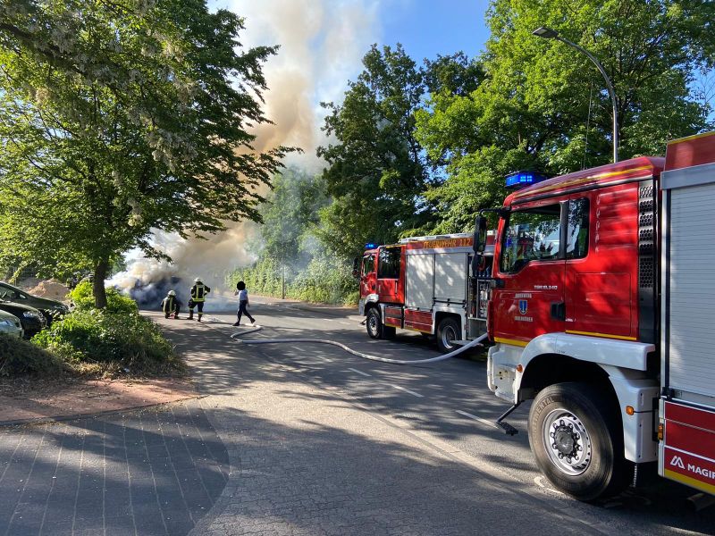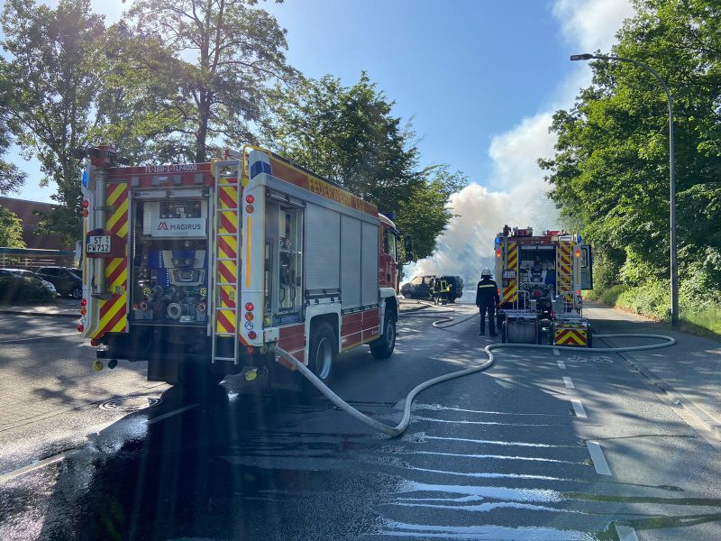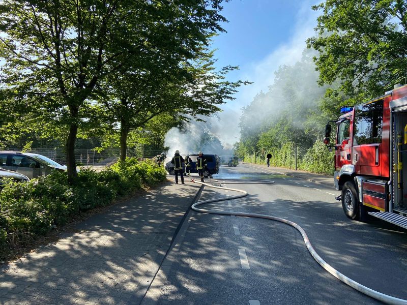 Beim Eintreffen der Feuerwehr brannte ein Bulli auf der Straße. Ein Trupp unter PA löschte das Feuer mit einem C-Hohlstrahlrohr.