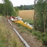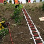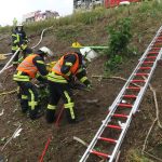 Nachdem der Höhenunterschied von ca. 15 Metern mit Leiterteilen überwunden war, wurde der Fahrer patientengerecht mit technischem Gerät befreit und mittels Schleifkorbtrage nach oben befördert und dem Rettungsdienst übergeben. Er wurde notärztlich behandelt und mit dem RTH in ein Krankenhaus verbracht.