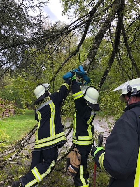 fanden an der Groner Allee folgende Lage vor: ein Baum war sturmbedingt in ca. 4-5 Metern Höhe abgebrochen und versperrte die Zufahrt zu einem Wanderparkplatz am Ende der Straße. Durch die unglückliche Lage des Baumes, der sich oberhalb in einen anderen Baum verkeilt hatte, wurde die DL und im Nachgang auch noch das HLF20-2 zur Einsatzstelle nachgeordert.