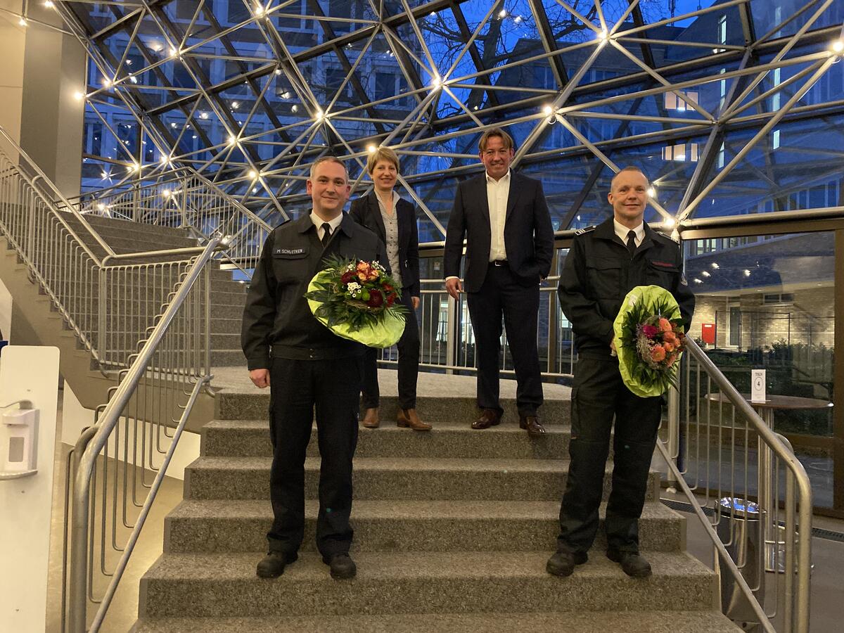 Marko Lammerskitten (50) war bis dato Stellvertreter des amtierenden Leiters der Feuerwehr, Karl-Heinz Rolf, der Ende April aus dem Amt scheidet. Lammerskitten war bereits im vergangenen Jahr zum neuen städtischen Fachdienstleiter Feuerwehr und Rettungsdienst bestellt worden, wo er ebenfalls Karl-Heinz Rolf nachfolgt. Marc Schüttken (46) war zuletzt stellvertretender Zugführer im Löschzug Stadtmitte 2.