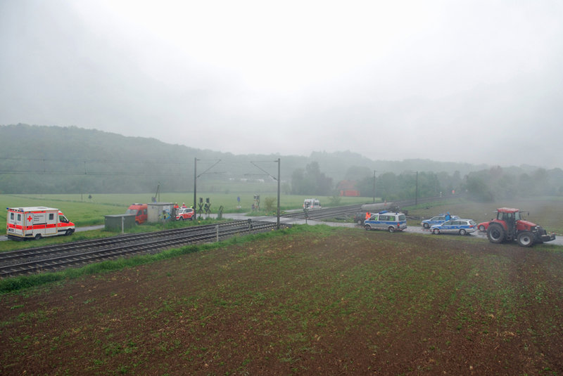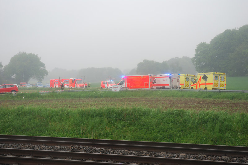 Noch auf der Anfahrt zur Einsatzstelle wurde vorsorglich ManV 1 (Massenanfall von Verletzten, Stufe 1) ausgelöst. An der Einsatzstelle fanden die ersteintreffenden Kräfte den Zug einige hundert Meter nach dem Bahnübergang vor, wo er zum Stehen gekommen war. Durch den Aufprall war der Zug im vorderen und seitlichen Bereich so stark beschädigt worden, dass der Lokführer und ein weiblicher Fahrgast bei dem Unfall getötet wurden.