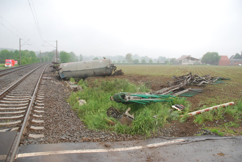 Ein Personenzug von Osnabrück in Richtung Rheine war auf dem Bahnübergang Fuchsweg mit einem Gülleanhänger, der sich von einem Trecker gelöst hatte und auf den Schienen zum Stehen gekommen war, kollidiert.