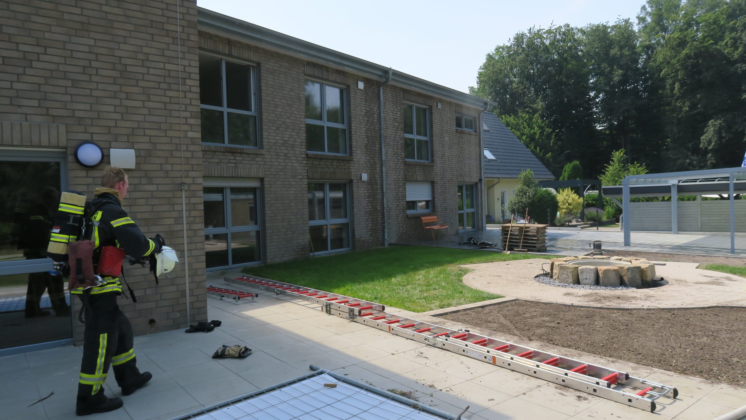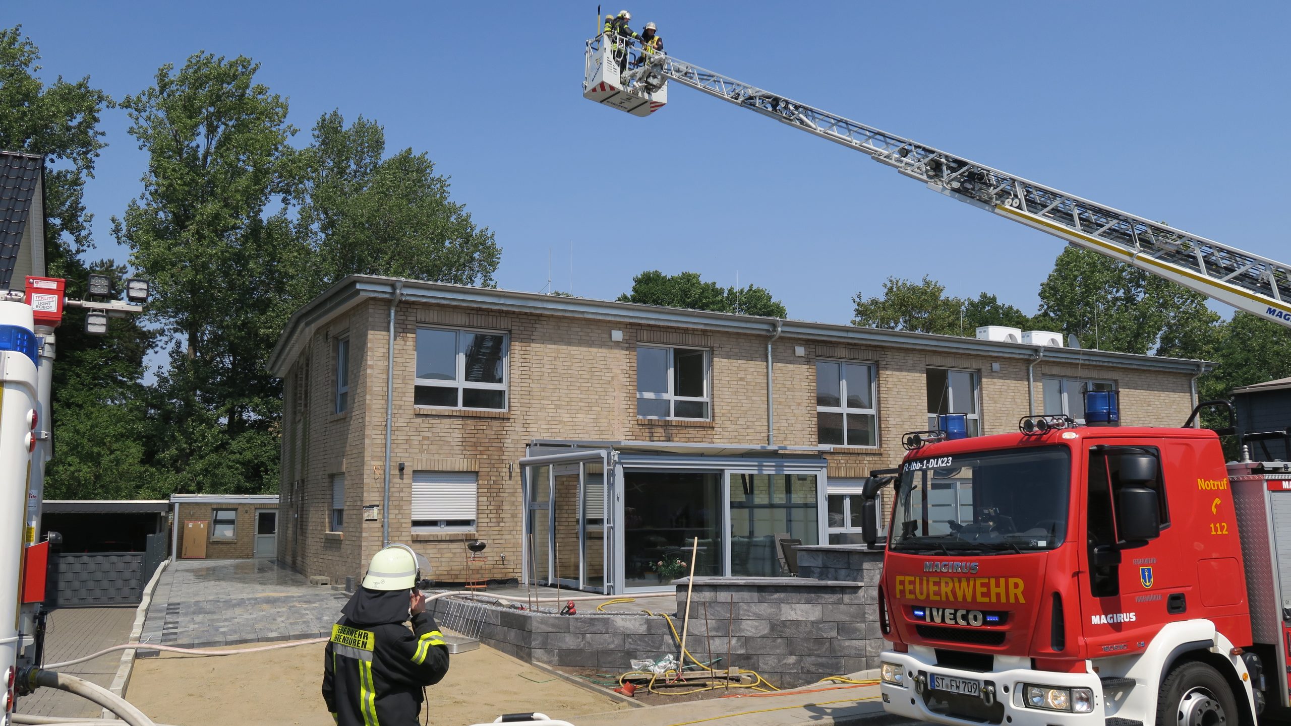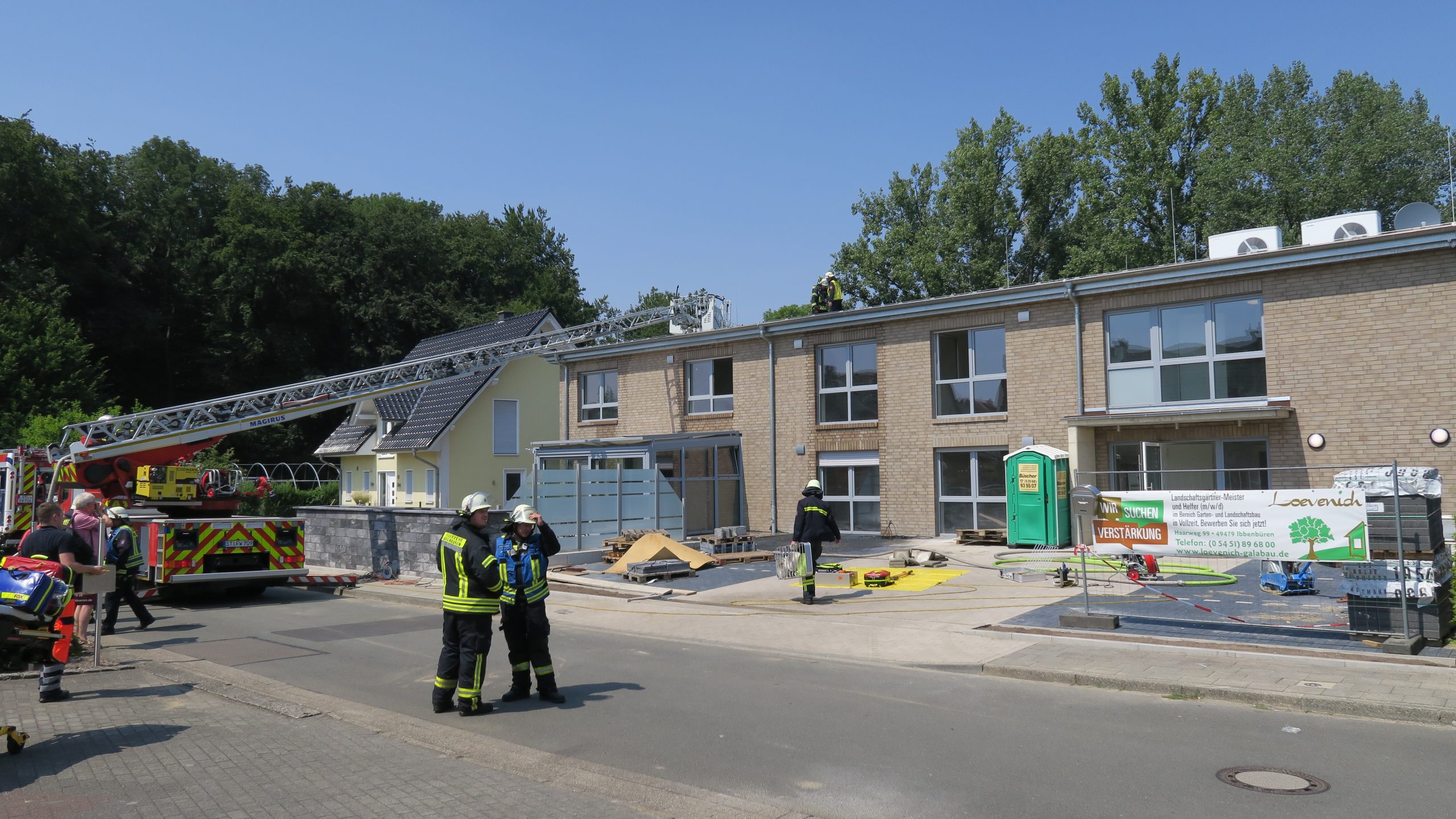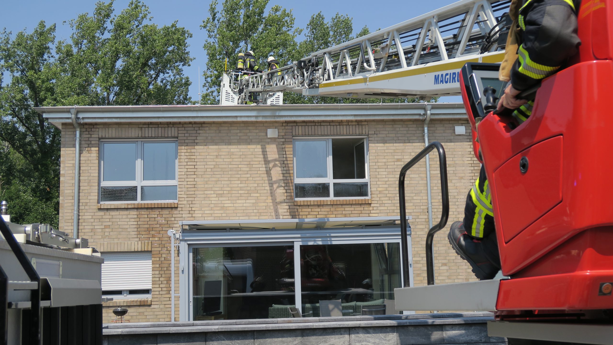 Auf dem Flachdach eines Neubaus war es zu einem Brand mit einer sehr starken Rauchentwicklung und Flammenbildung gekommen. Alle Personen konnten aus dem Gebäude evakuiert werden.