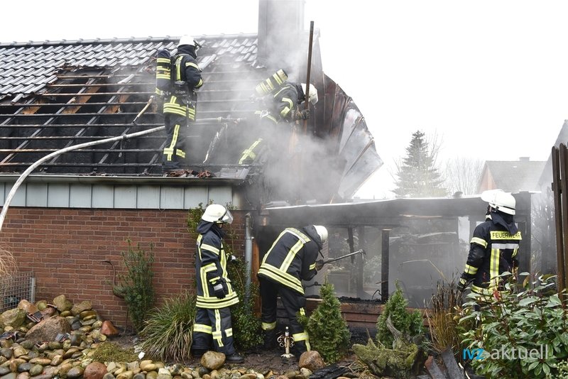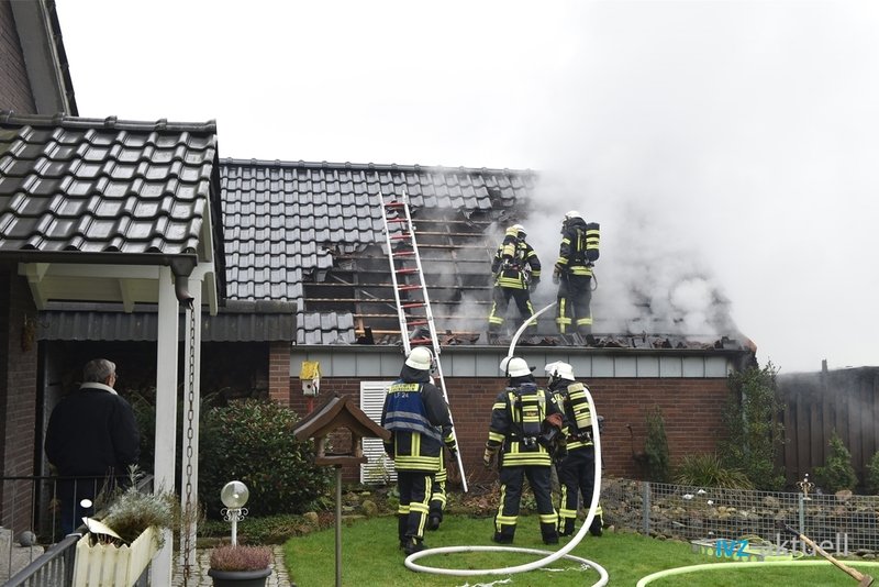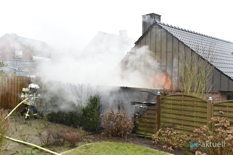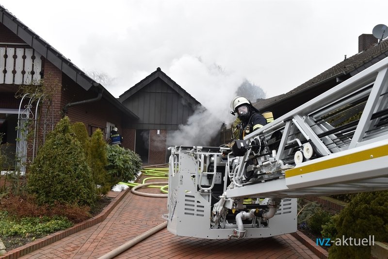 Beim Eintreffen fanden die Kräfte den hinteren Teil einer Garage in Vollbrand vor. Die Garage war direkt an ein Wohnhaus angebaut; es befand sich kein Pkw in der Garage, Personen waren nicht in Gefahr.