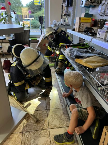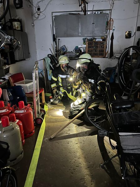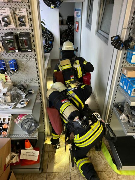 Zur Menschenrettung gingen mehrere Trupps unter umluftunabhängigem Atemschutz in die Gebäudeteile vor. Durch weitere Trupps wurden Riegelstellungen zum nicht betroffenen Gebäudeteil aufgebaut und zu einem Gasflaschenlager auf der Rückseite des Geländes.