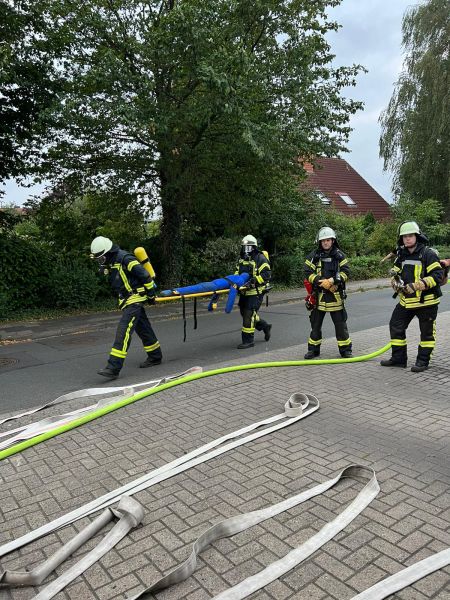 Nach kurzer Zeit konnten alle Personen gerettet werden und wurden an der Rettungsdienst übergeben. Damit endete die Übung nach ca. 1,5 Stunden. Nachdem alle Geräte verstaut und wieder einsatzbereit waren, versammelten sich alle Teilnehmer im Gerätehaus Laggenbeck.
