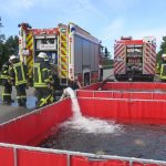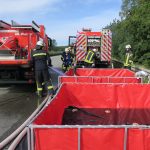 Zur Wasserversorgung waren neben dem HLF und den LFs noch das TLF4000 und der Abrollbehälter Wasser im Einsatz. Dazu wurden zwei Husky-Wasserbehälter (je 5.000 Liter) als Pufferstation an der Einsatzstelle eingerichtet. Über einen Pendelverkehr wurden diese dann immer wieder befüllt und stellten somit eine ausreichende Wasserversorgung dar.