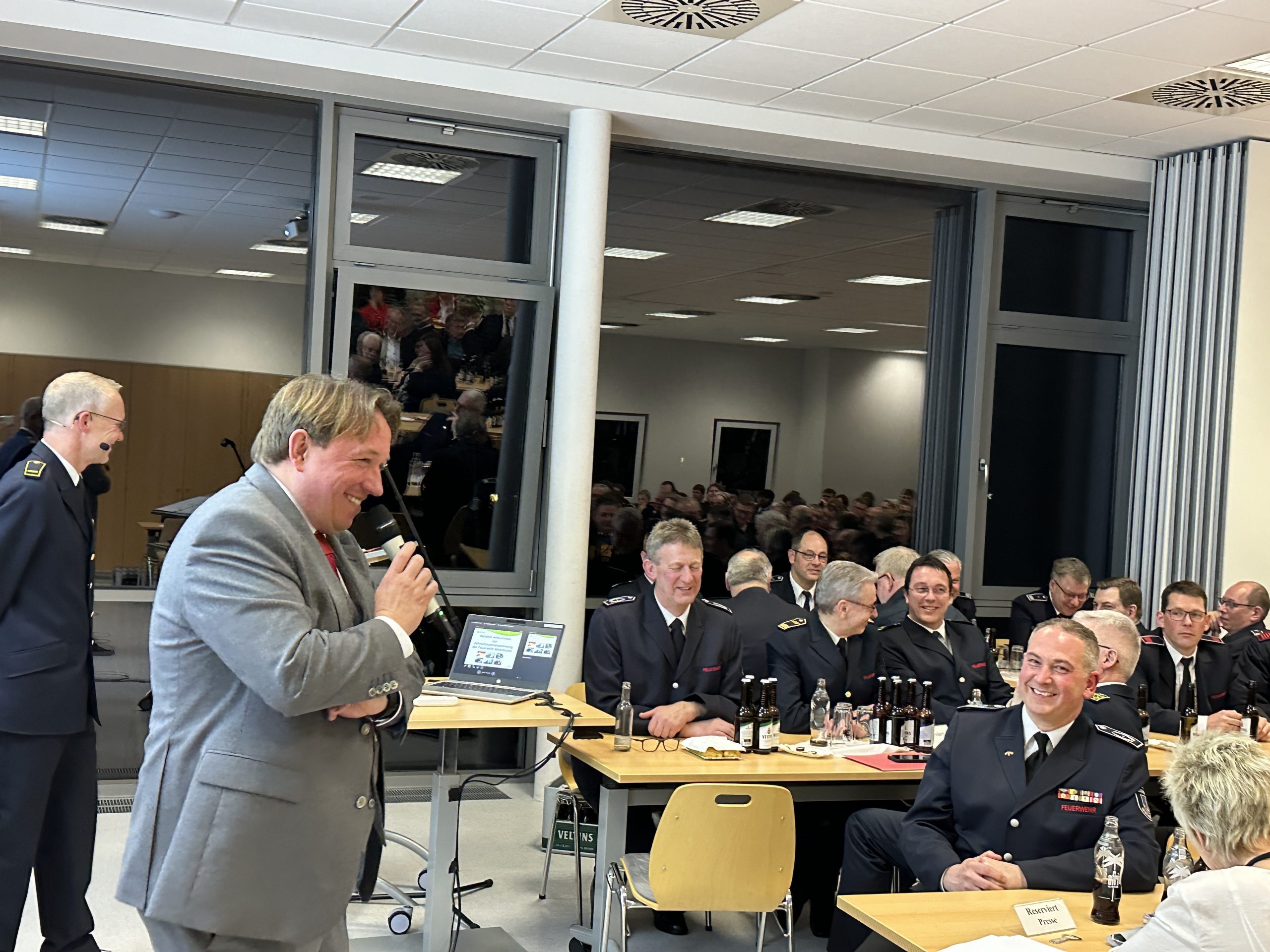 So fasste Bürgermeister Dr. Marc Schrameyer in seiner Begrüßung auch zusammen, dass sein Dank allen Kameradinnen und Kameraden gilt, die sich der großen Belastung vieler – manchmal auch schwerer – Einsätze aussetzten und so manchen Abend mit Übungen und Einsätzen verbringen. „Man kann gar nicht genug hervorheben, wie wichtig dieses Ehrenamt für die Gesellschaft ist.“, sagte der Verwaltungschef. Er appellierte an die Anwesenden, weiterhin Werbung für dieses Ehrenamt zu machen. „Es ist elementar wichtig und dazu eine tolle Gemeinschaft.“