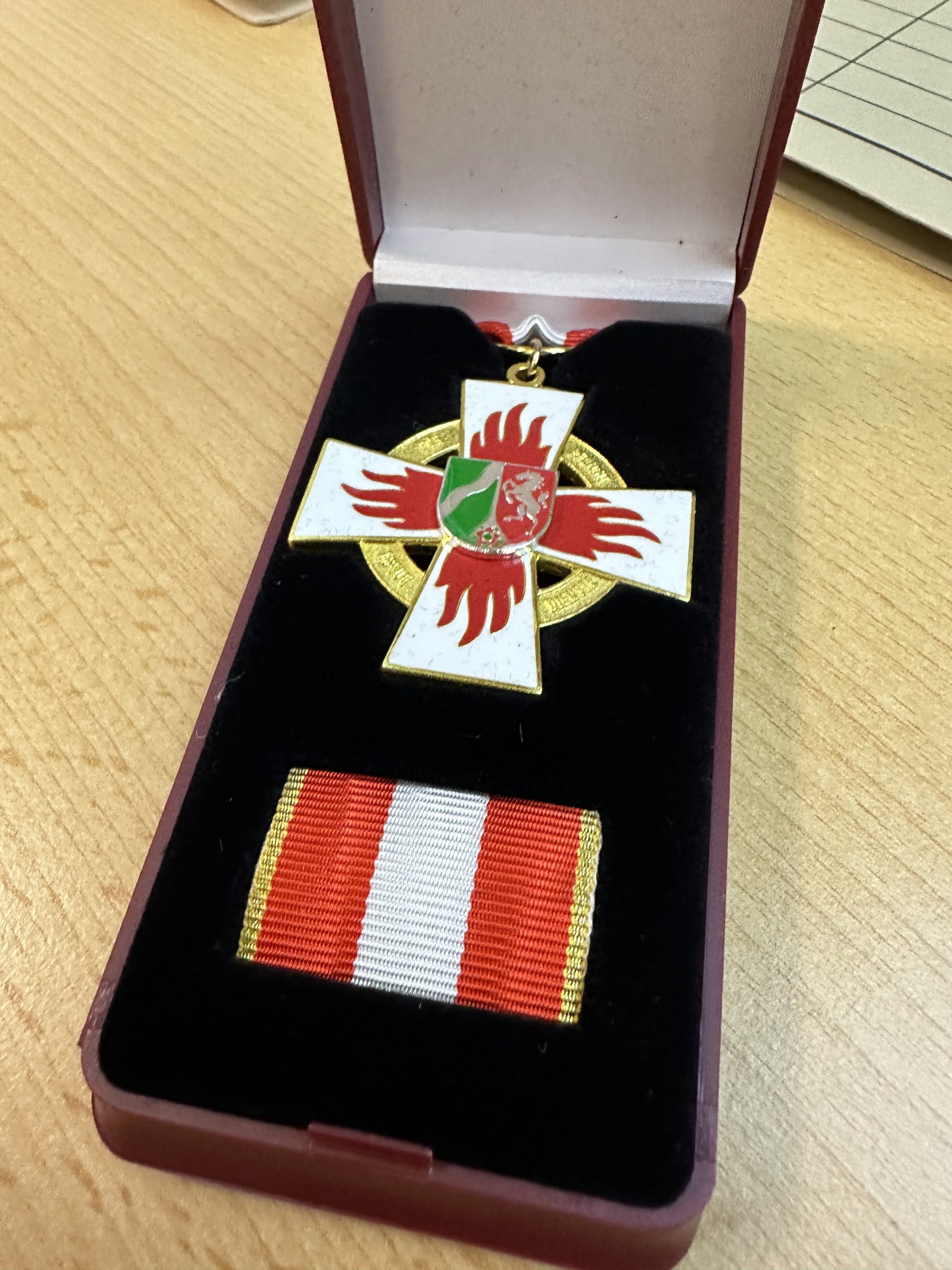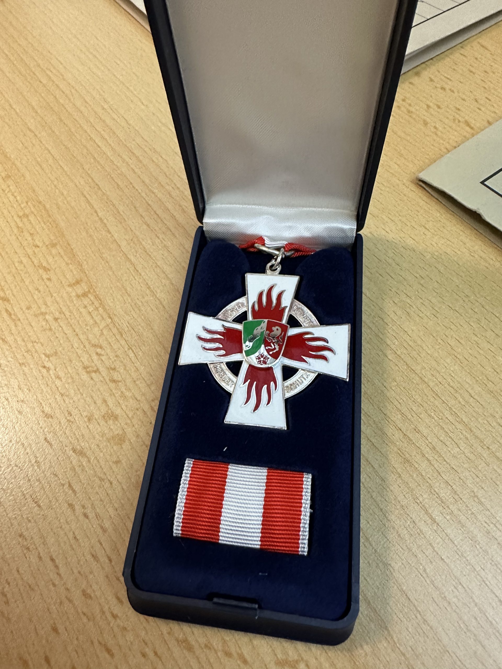 Das Feuerwehr-Ehrenzeichen des Landes NRW in Silber, für 25 Jahre aktiven Dienst im Feuerschutz, erhalten: