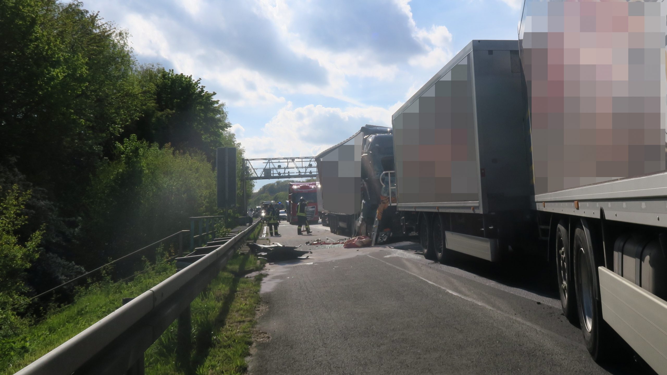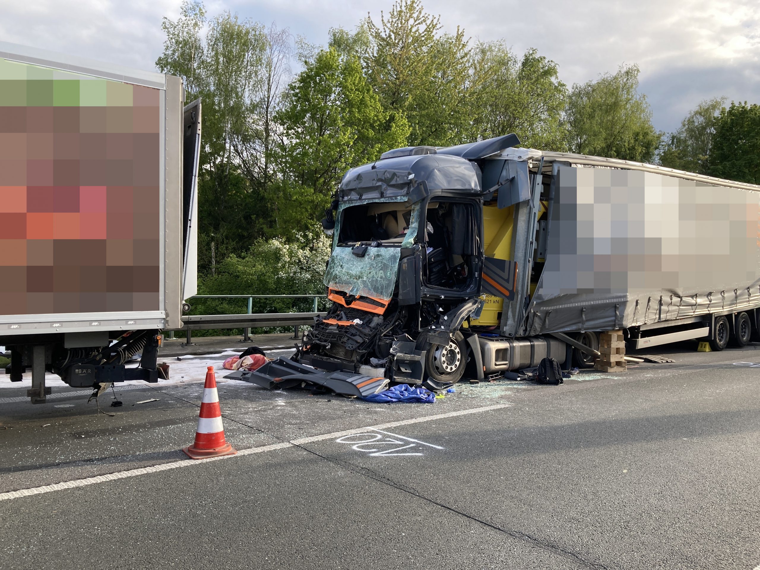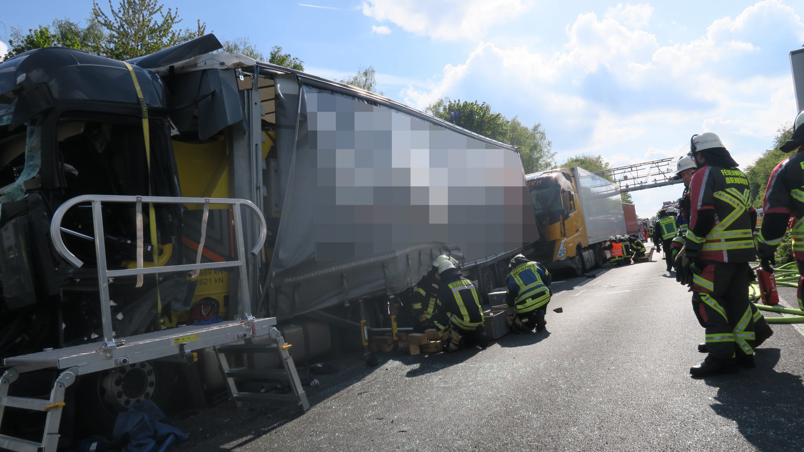 Insgesamt vier Lkw waren an einem Stauende kollidiert. Ein Fahrer war dabei in seinem Fahrzeug eingeklemmt worden. Die übrigen beteiligten Fahrer waren nicht eingeklemmt. Sie wurden vom Rettungsdienst betreut.