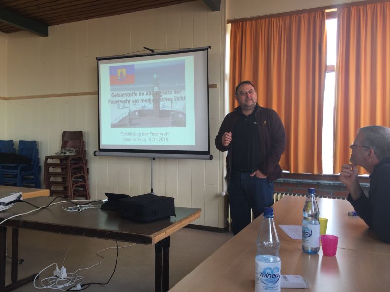 Auf die Wirkung von Gefahrstoffen im ABC-Einsatz, aus medizinischer Sicht, ging der Fachberater Arzt der Feuerwehr Ibbenbüren, Dr. Michael Micke, ausführlichst ein. Er informierte die Teilnehmer umfassend und anschaulich über das ganze Spektrum der Gefahrenklassen und der damit verbunden Besonderheiten. Auch ging Dr. Micke auf einige Gefahrstoffe in Bezug auf die Bevorratung in diversen Ibbenbürener Firmen ein.