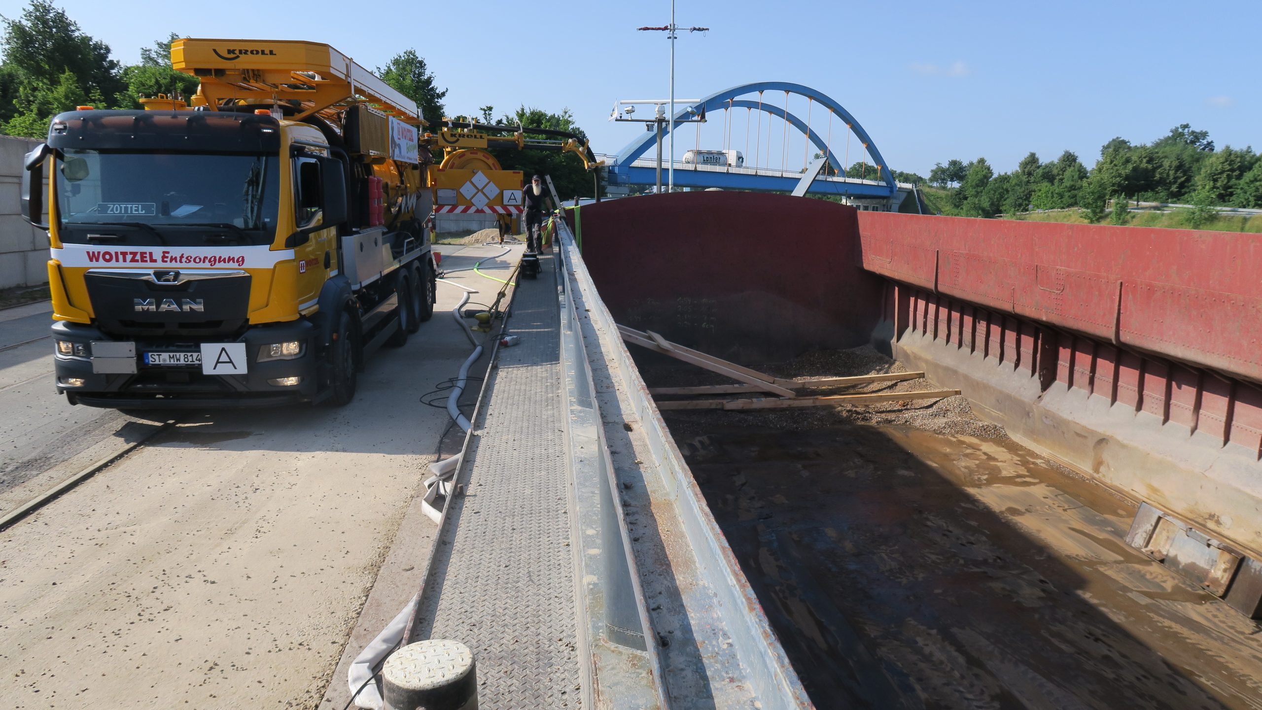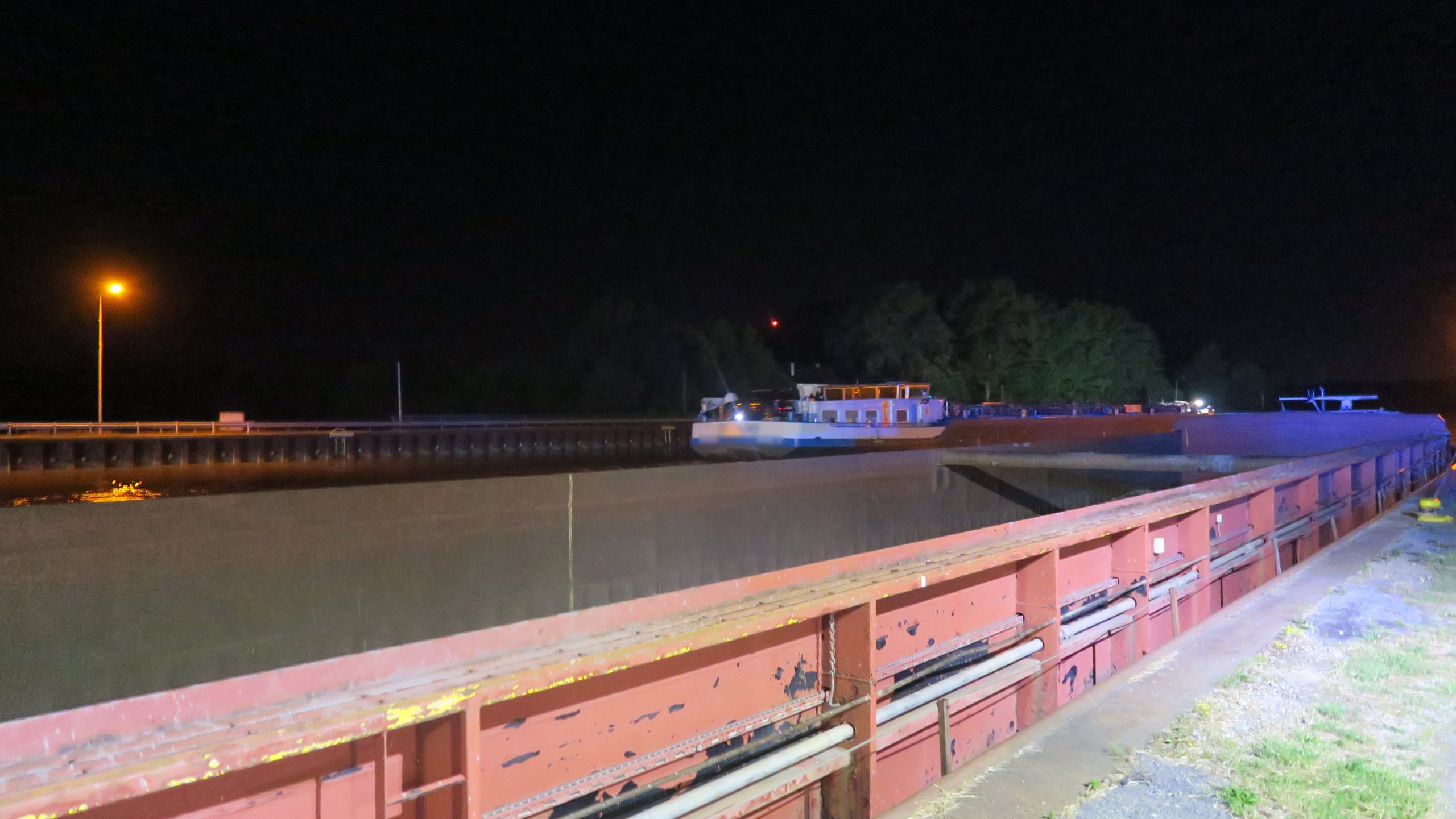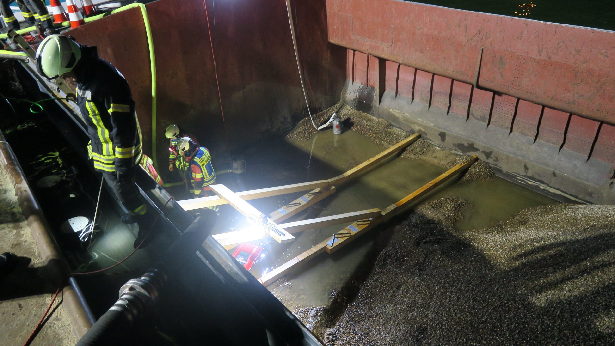Ein mit Kies beladenes Güterschiff war leckgeschlagen und es drang Wasser ein. Das Leck wurde nach kurzer Erkundung gefunden, Abdichtungsmaßnahmen wurden vorgenommen. Parallel wurde unkontaminiertes Wasser aus dem Schiff gepumpt.