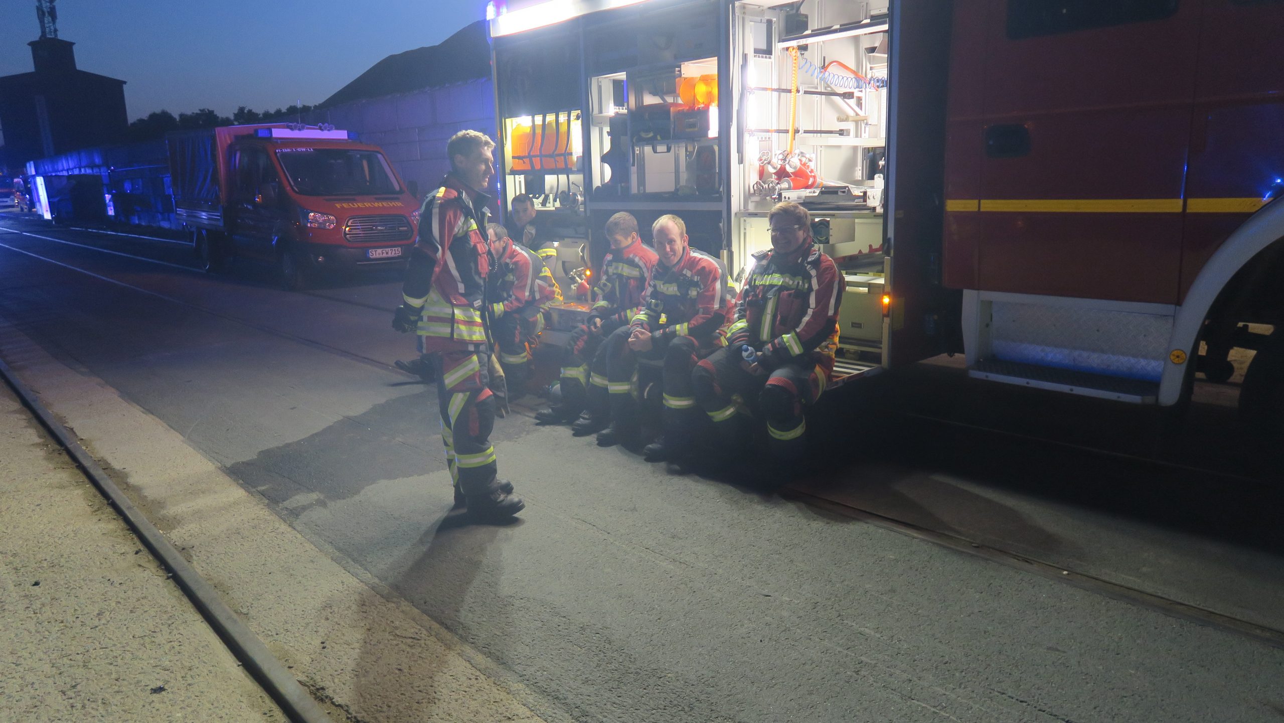 Eingesetzte Fahrzeuge: KdoW-2, HLF20-1, DLK23, WLF26-KR mit AB-Rüst, 3-LF10, 3-MTF, 3-DekonP, LF10-1, ELW1, Leiter, MTF-2 mit RTB2, GW-L1, WLF26 mit AB-Ölsperren, LF10-2, MTF-3, Fachberater des THW