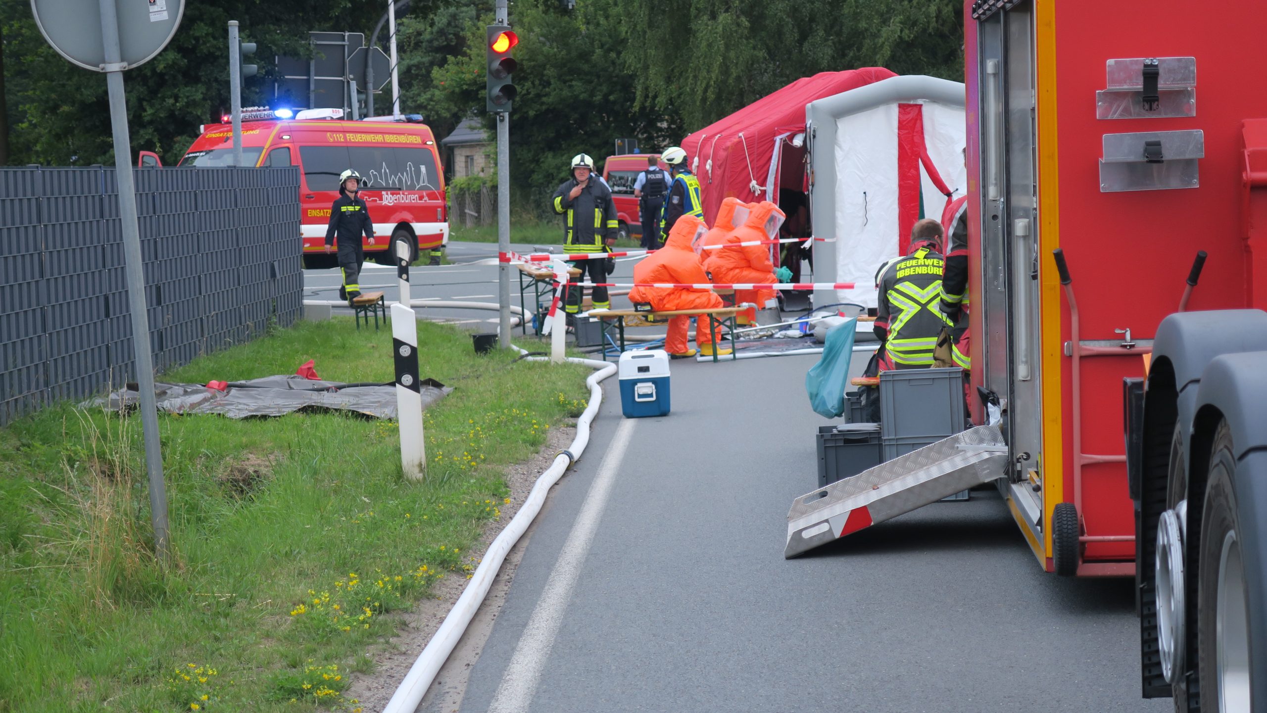 Eingesetzte Fahrzeuge: KdoW-1, KdoW-2, HLF20-1, WLF-3 mit AB-ABC, TLF4000, ELW1, LF20KatS, GW-L1, MTF-2, 2-ABC-Erk, 2-LF10, 3-DekonP, 3-LF10, FB-ABC-Ibbenbüren, RTW-2, NEF-1