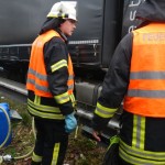 Die Feuerwehr dämmte zunächst den bereits ausgelaufenen Kraftstoff ein, so dass keine weitere Umweltgefährdung davon ausging. Dann wurde der weiter auslaufende Diesel aufgefangen und der auf die Fahrbahn gelaufende Kraftstoff abgestreut. Des Weiteren wurde die schadhafte Stelle am Dieseltank abgedichtet.