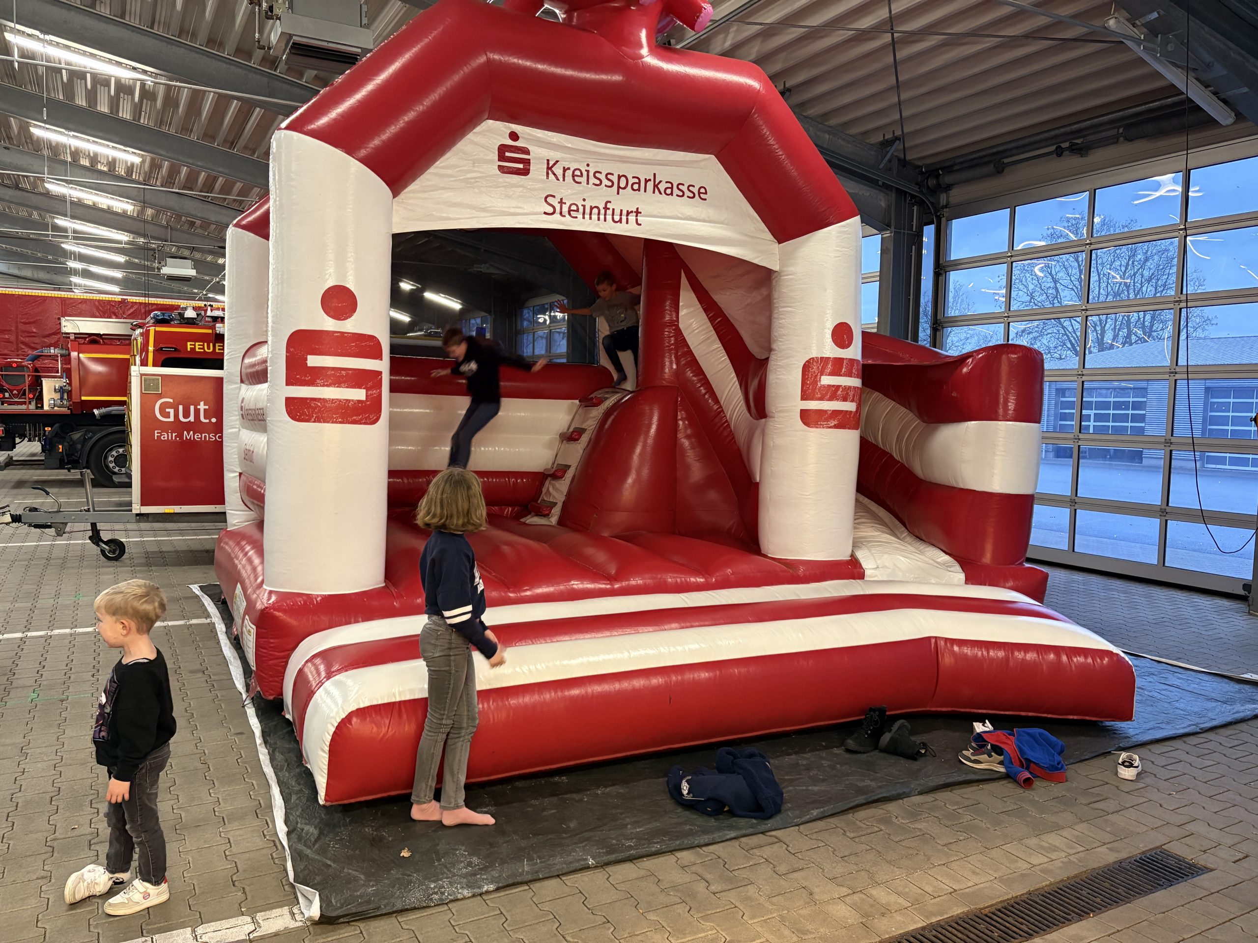 Für die Kleinen war dieses Jahr wieder bestens gesorgt. Es gab die Möglichkeit zu Malen, eine Button-Maschine und die Hüpfburg der Kreissparkasse Steinfurt war ebenfalls in der Fahrzeughalle aufgebaut worden. Natürlich sind gerade auch die Feuerwehrfahrzeuge in der Fahrzeughalle beim Nachwuchs hoch im Kurs und wollen voll umfänglich entdeckt werden. Auch eine Rundfahrt im Feuerwehrfahrzeug gehörte natürlich dazu!