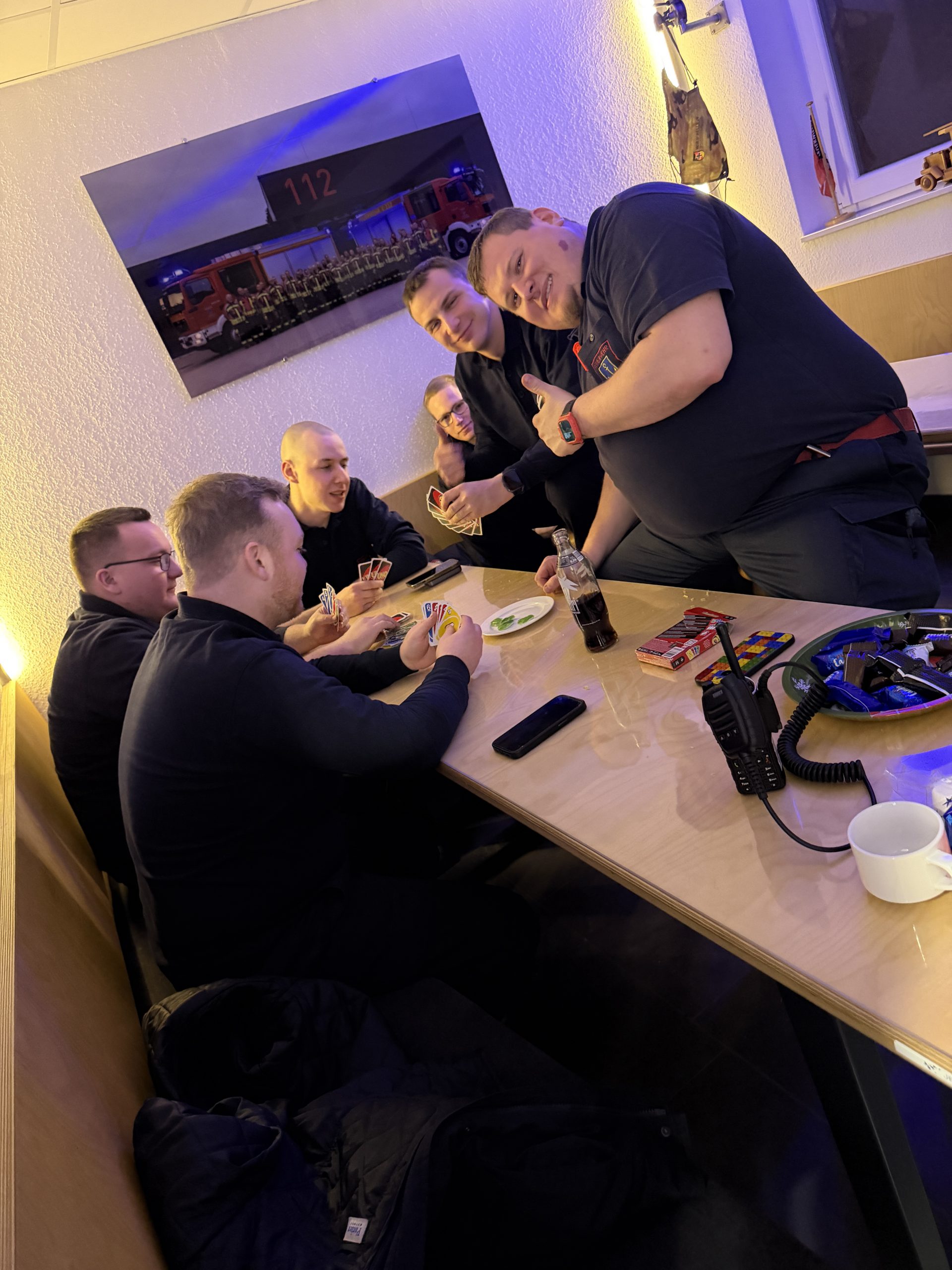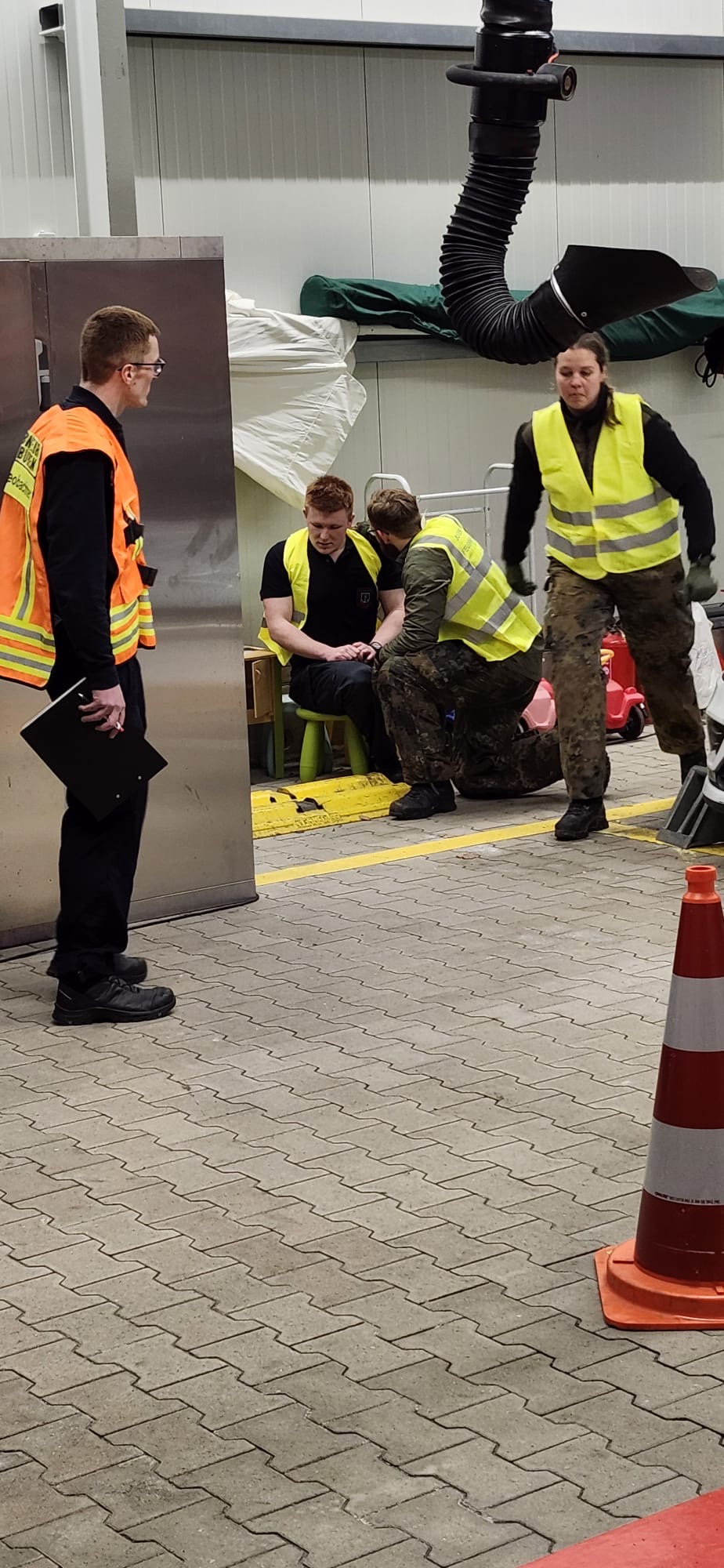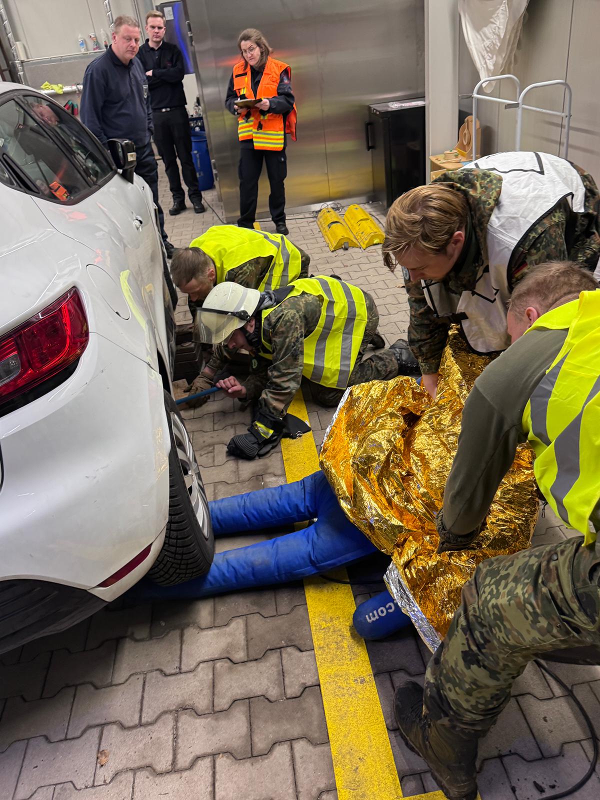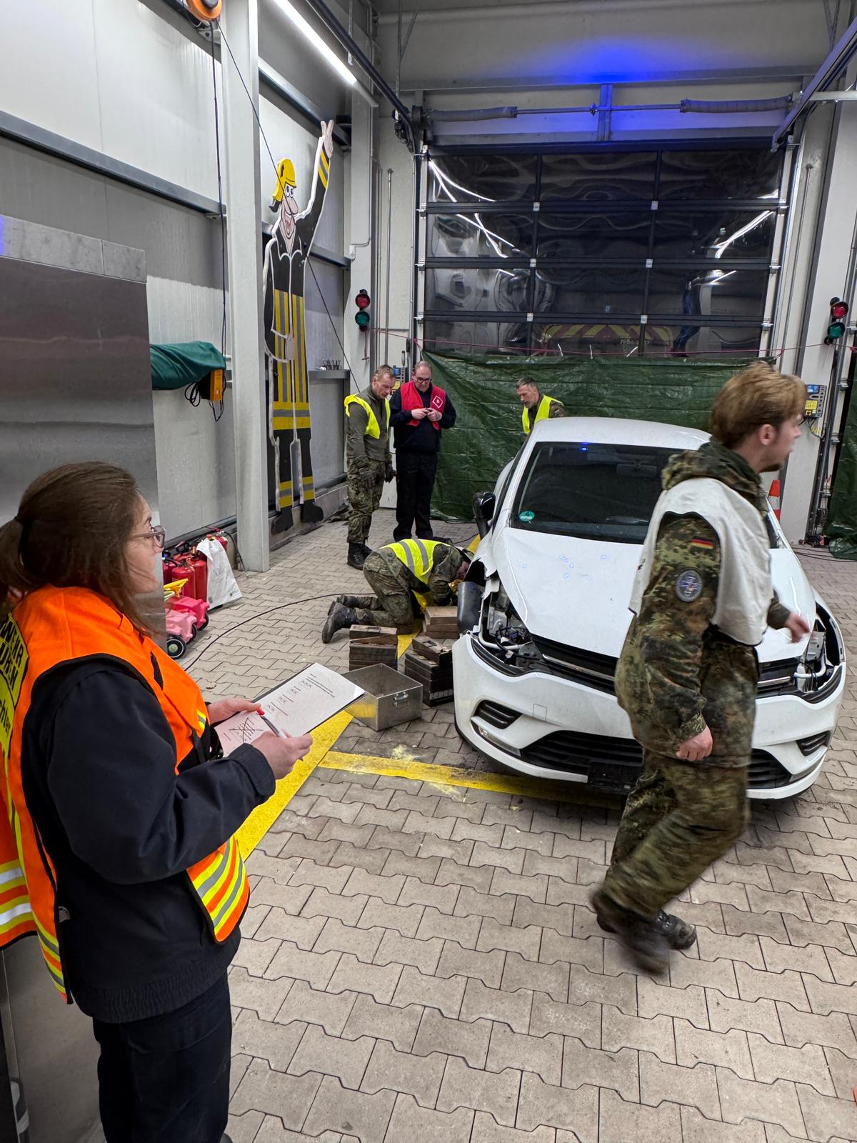 Die Kameradinnen und Kameraden der Feuerwehr betreuen die Station in vier Schichten. Neben der Vor- und Nachbereitung des Einsatzszenarios wurden auch mehrere Statisten von der Feuerwehr gespielt (Leitstelle, Rettungsdienst, Fahrzeugführer).