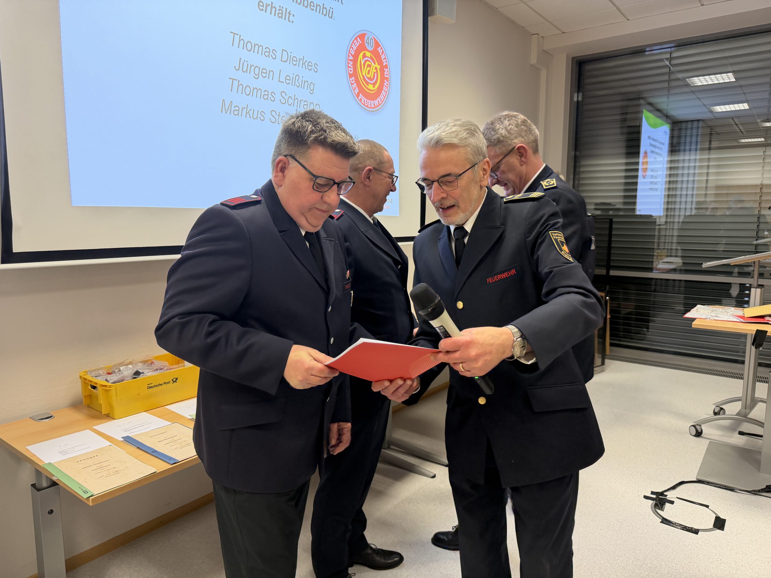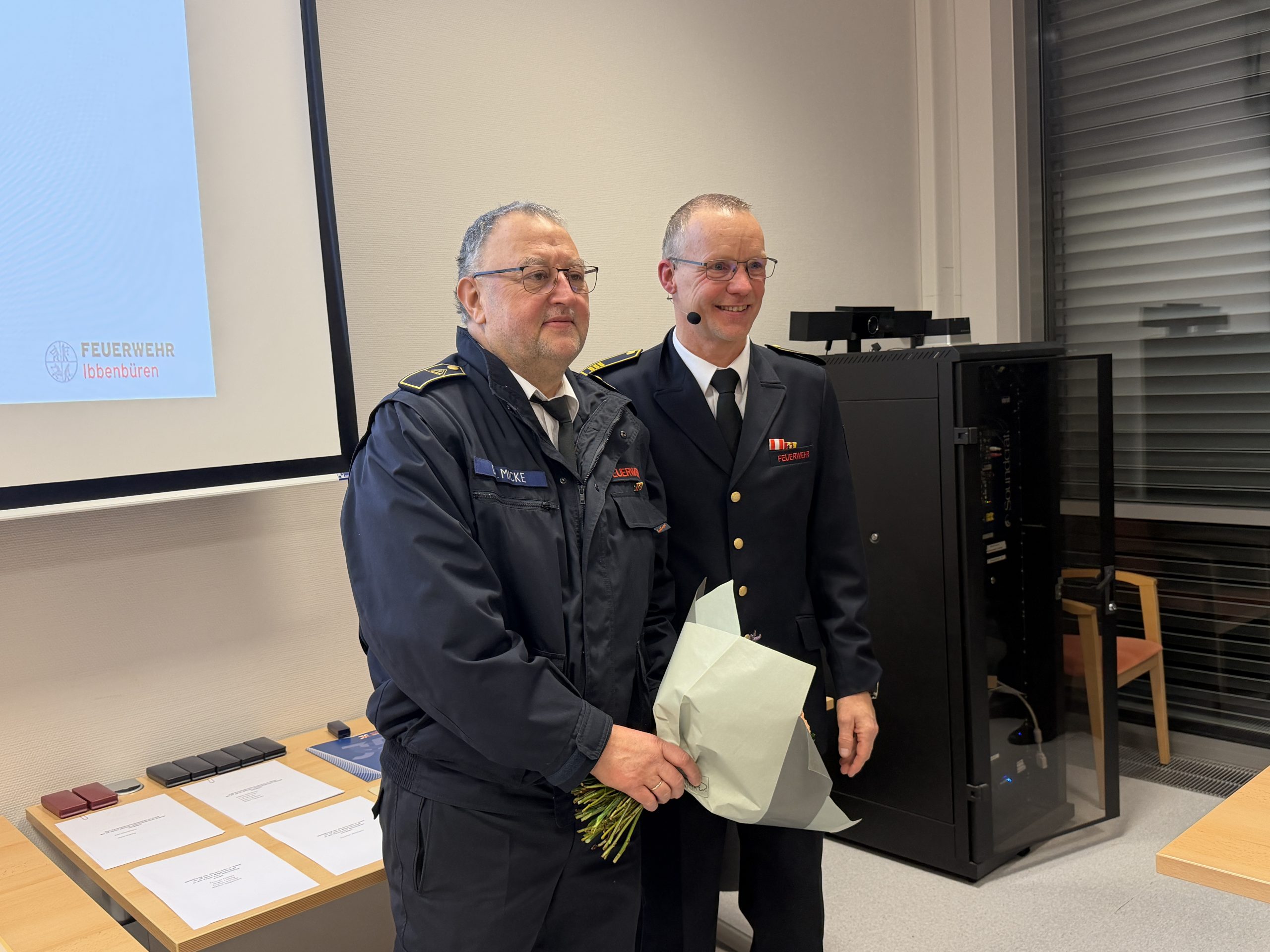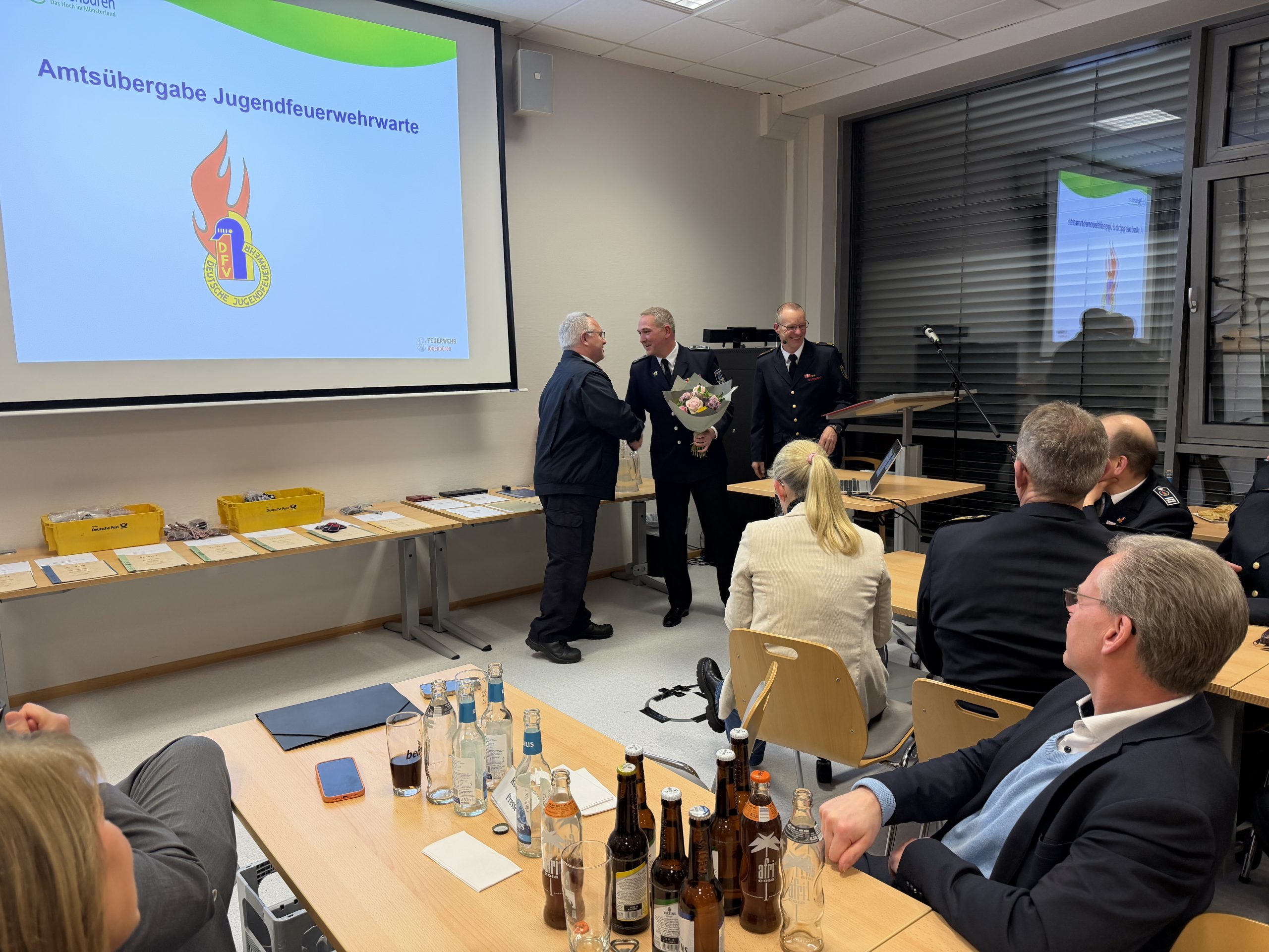 Es folgten zwei Amtsübergaben. Dr. Michael Micke schied aus seinem Amt als Feuerwehrarzt aus. Zukünftig wird die Funktion der Feuerwehrärztin von Dr. Nina Veerkamp übernommen. In der Jugendfeuerwehr gab es ebenfalls einen Wechsel. Markus Schoppe übergab die Funktion des Jugendfeuerwehrwartes an Niklas Dieselkämper (Jugendfeuerwehrwart) und Tina Dieselkämper (Stv. Jugendfeuerwehrwartin).