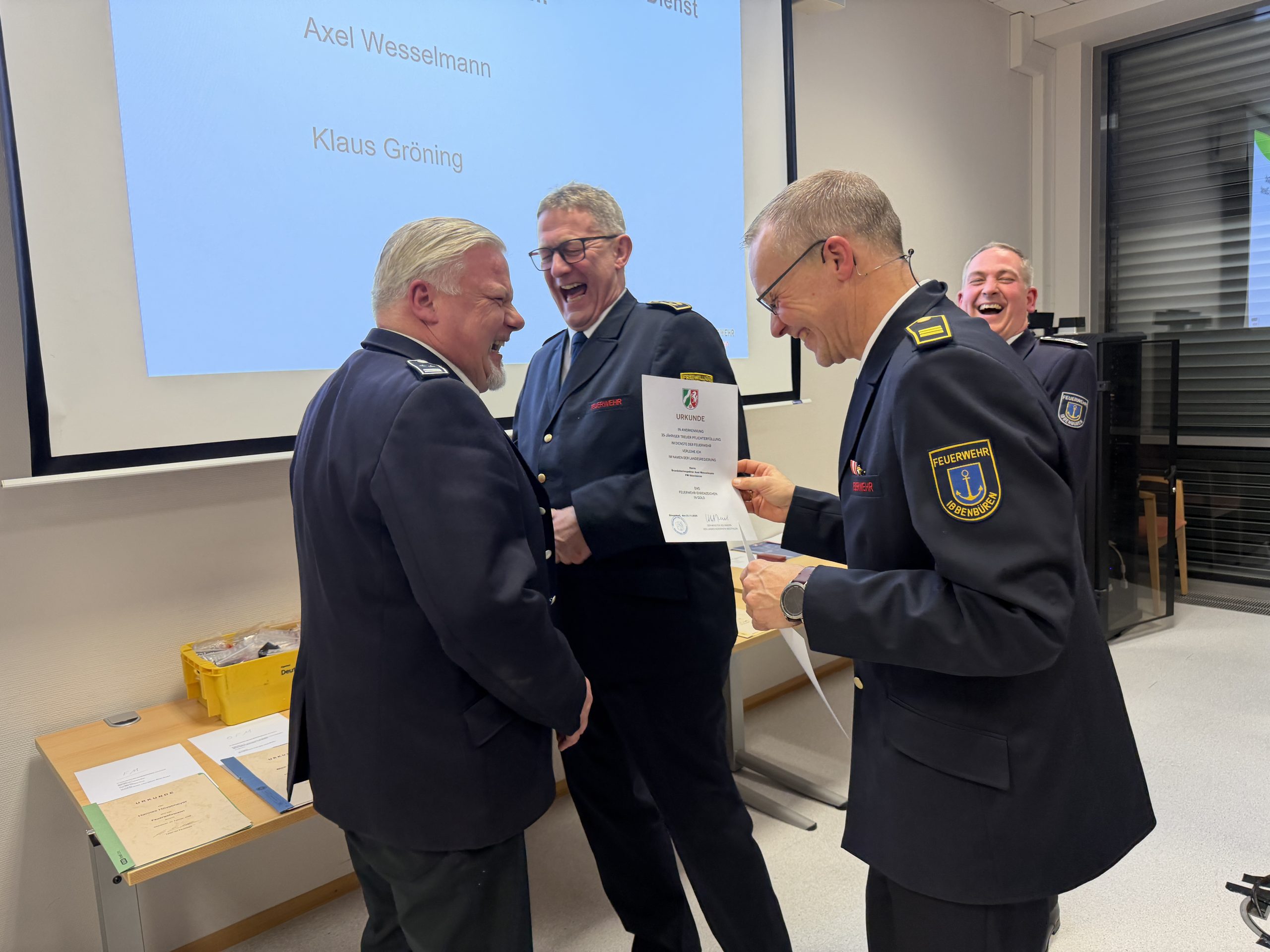 Das Feuerwehrehrenabzeichen in Gold für 35 Jahre aktiven, ehrenamtlichen Dienst erhielten: Axel Wesselmann und Klaus Gröning.