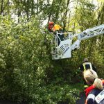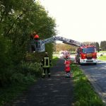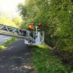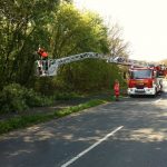 Ein Baum war umgestürzt und lag über den Rad/ Gehweg. Die Baumkrone hatte sich in einer Telefonleitung verfangen, so das die Drehleiter zum Einsatz kam. Der Baum wurde vorsichtig mit der Motorsäge zerkleinert. Die Telefonleitung blieb intakt. Der zerkleinerte Baum wurde am Straßenrand abgelegt.