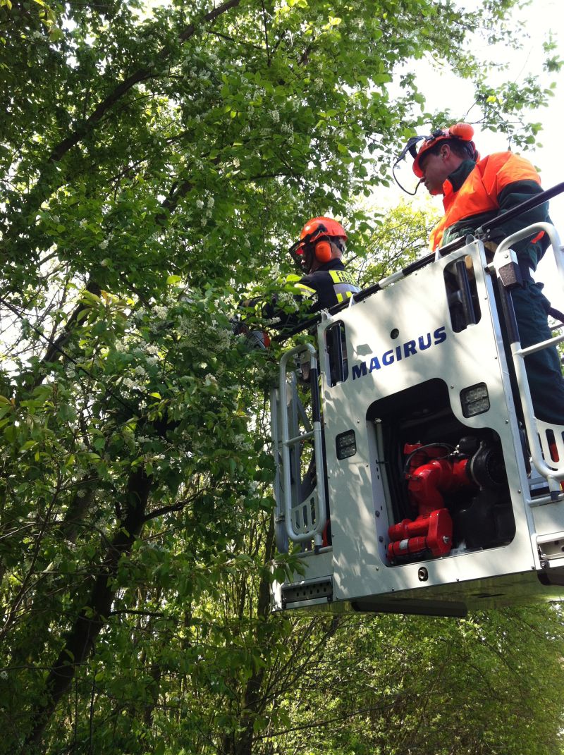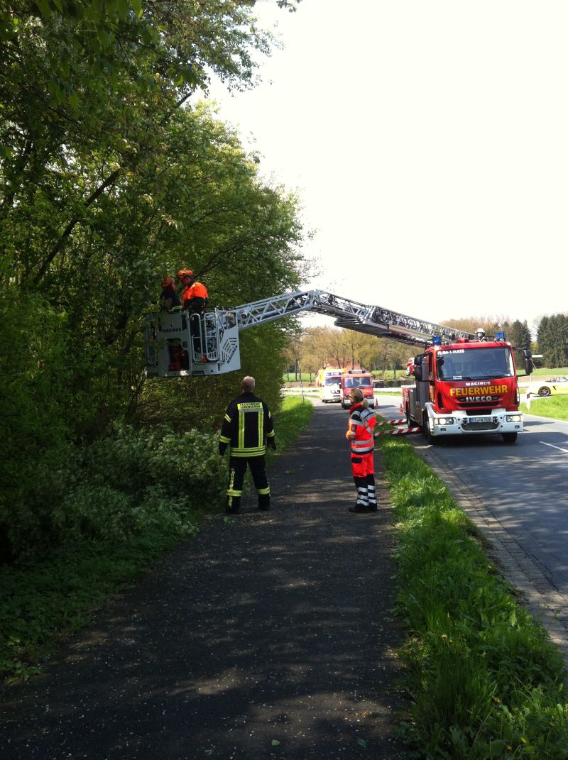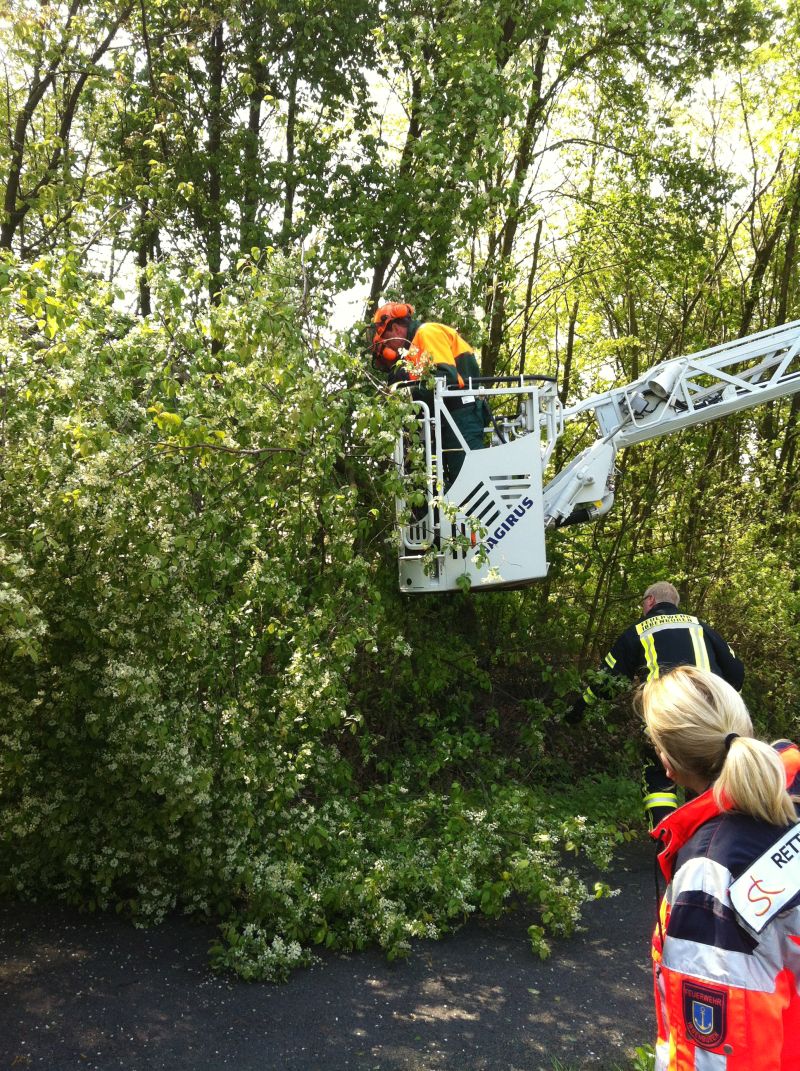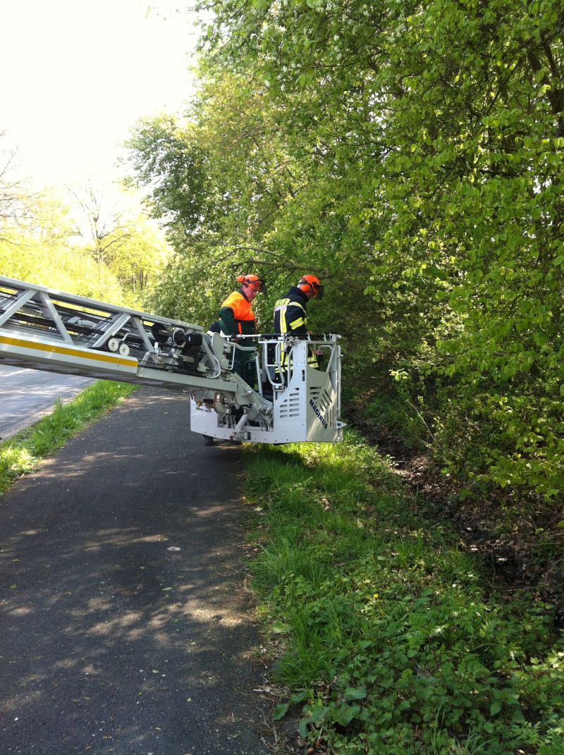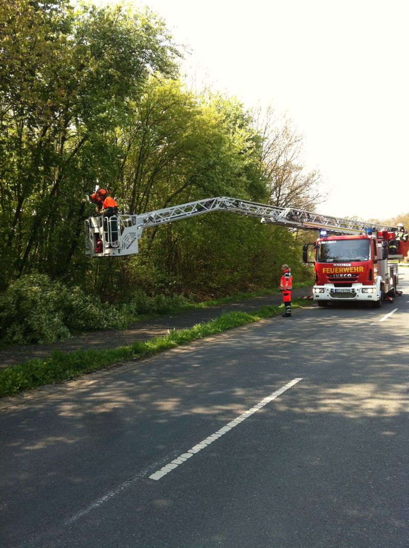 Ein Baum war umgestürzt und lag über den Rad/ Gehweg. Die Baumkrone hatte sich in einer Telefonleitung verfangen, so das die Drehleiter zum Einsatz kam. Der Baum wurde vorsichtig mit der Motorsäge zerkleinert. Die Telefonleitung blieb intakt. Der zerkleinerte Baum wurde am Straßenrand abgelegt.