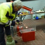 Auf Propan folgte Acetylen in Kombination mit Sauerstoff. Ein Teil der Vorführung befasste sich mit dem Rückschlag einer Flamme in eine Gasflasche und wie die entsprechenden Sicherheitsmaßnahmen Schlimmeres verhindern.