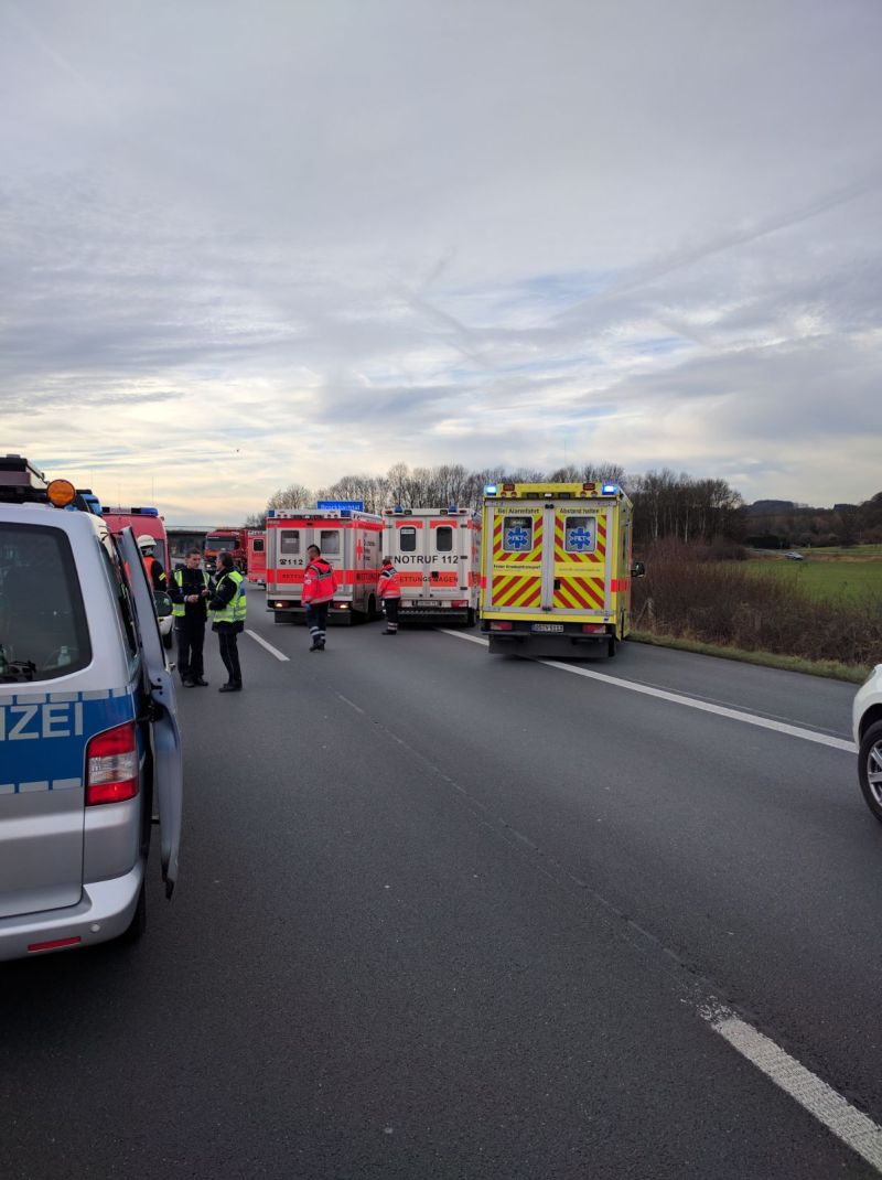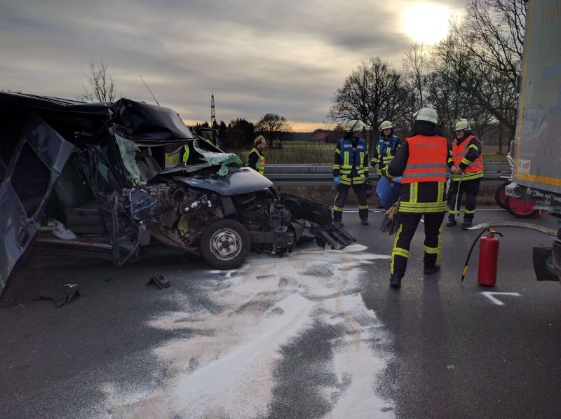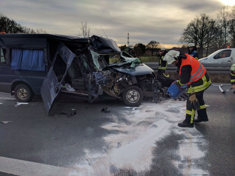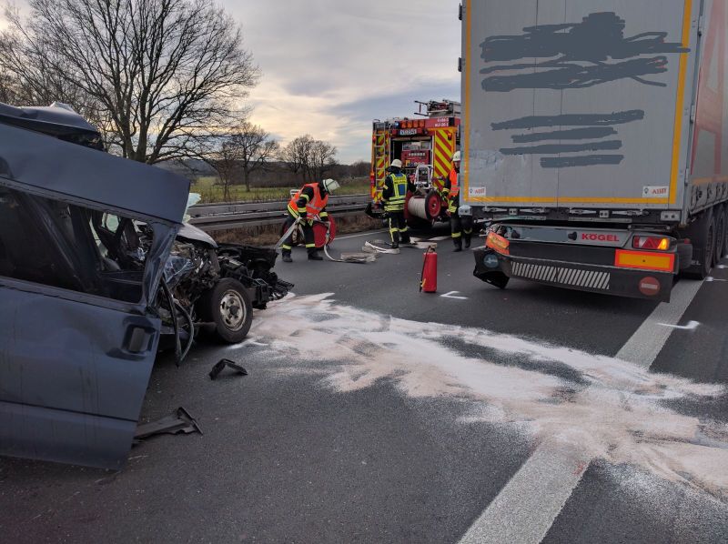 Die weiteren Einsatzkräfte stellten den Brandschutz sicher. Ausgelaufene Betriebsstoffe wurden mit Bindemittel abgestreut. Die Fahrzeugbatterie des verunfallten PKW wurde abgeklemmt. Die Feuerwehr Ibbenbüren war mit insgesamt 35 Einsatzkräften zur Einsatzstelle ausgerückt. Die Einsatzstelle wurde der Autobahnpolizei übergeben.