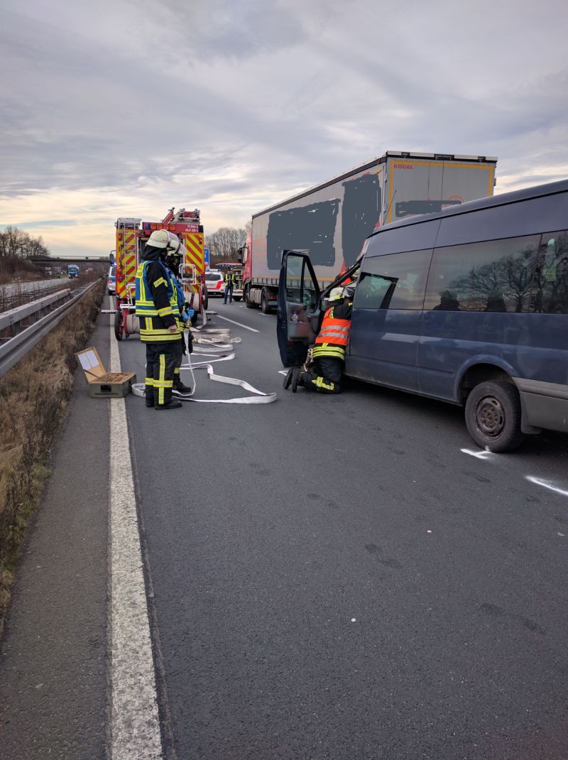 Einsatzbericht: Am Donnerstagmittag wurden der Dienstbetrieb und der Löschzug Stadtmitte 1 auf die BAB 30 alarmiert. Ein Kleinbus war auf einen LKW aufgefahren. In den ersten Meldungen hieß es, dass Personen eingeklemmt wären. An der Einsatzstelle stellte sich heraus, dass keine Person mehr eingeklemmt war. Durch Feuerwehr und Rettungsdienst wurden insgesamt fünf Patienten medizinisch versorgt und in umliegende Krankenhäuser transportiert.
