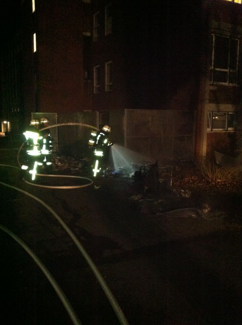 Zum ersten Containerbrand an den Kaufmännische Schulen wurde nur der Dienstbetrieb alarmiert. Bereits auf der Anfahrt wurde ein weiteres Feuer an der Wilhelmstraße gemeldet. Der Einsatzleiter ließ daraufhin einen Löschzug nachalarmieren.
